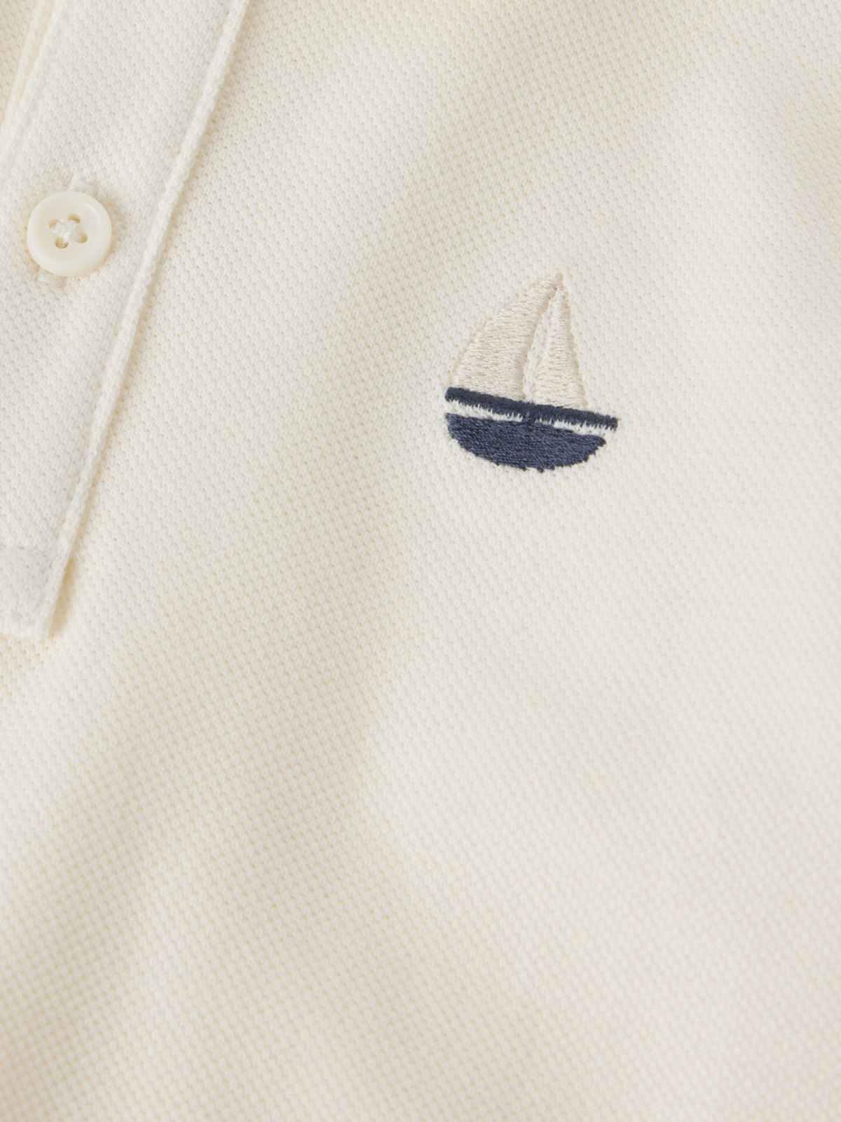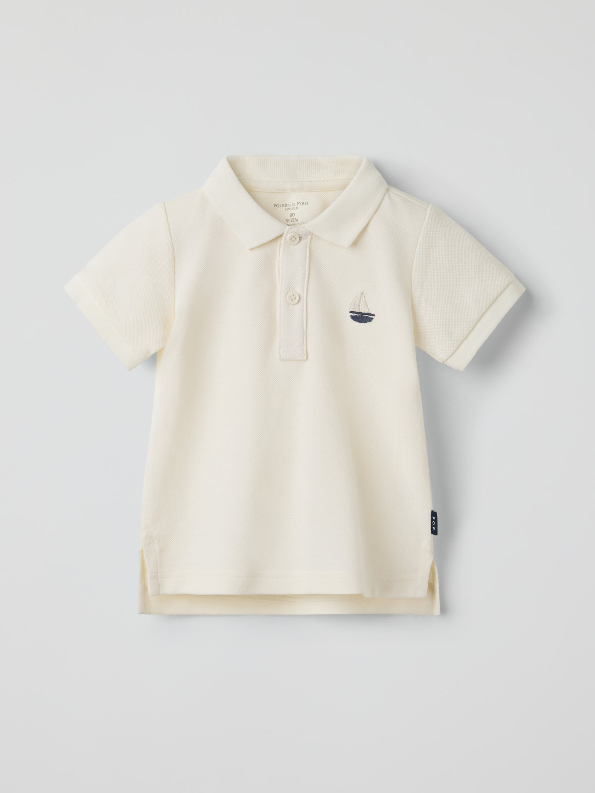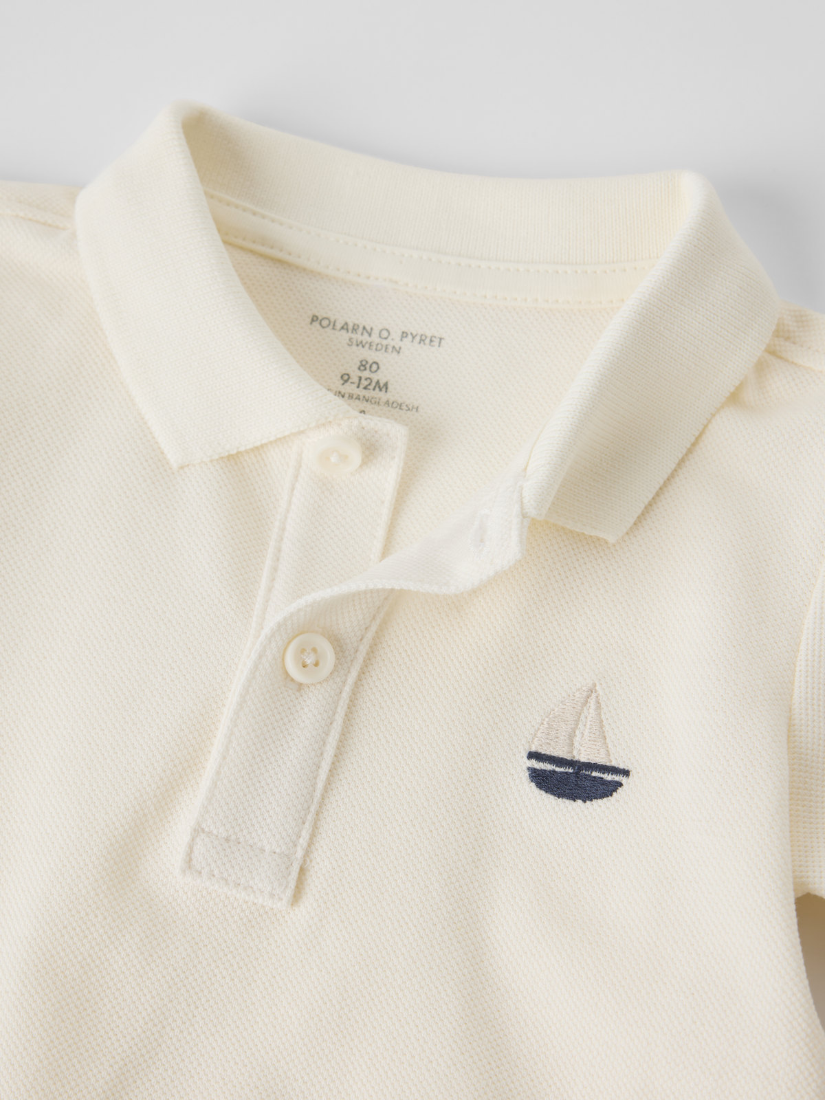 Kortärmad pikétröja i 100 % ekologisk bomull med krage och knappslå för baby – ett fint plagg för alla tillfällen! Tröjan har en liten segelbåt broderad på bröstet och ribbad mudd i ärmslut för skön passform.