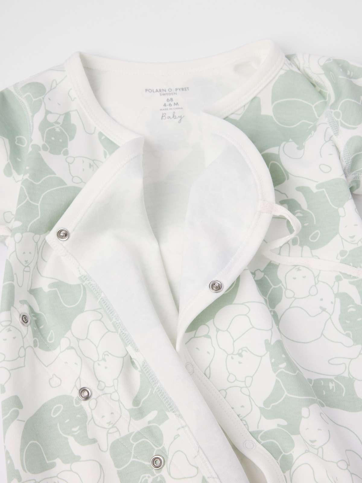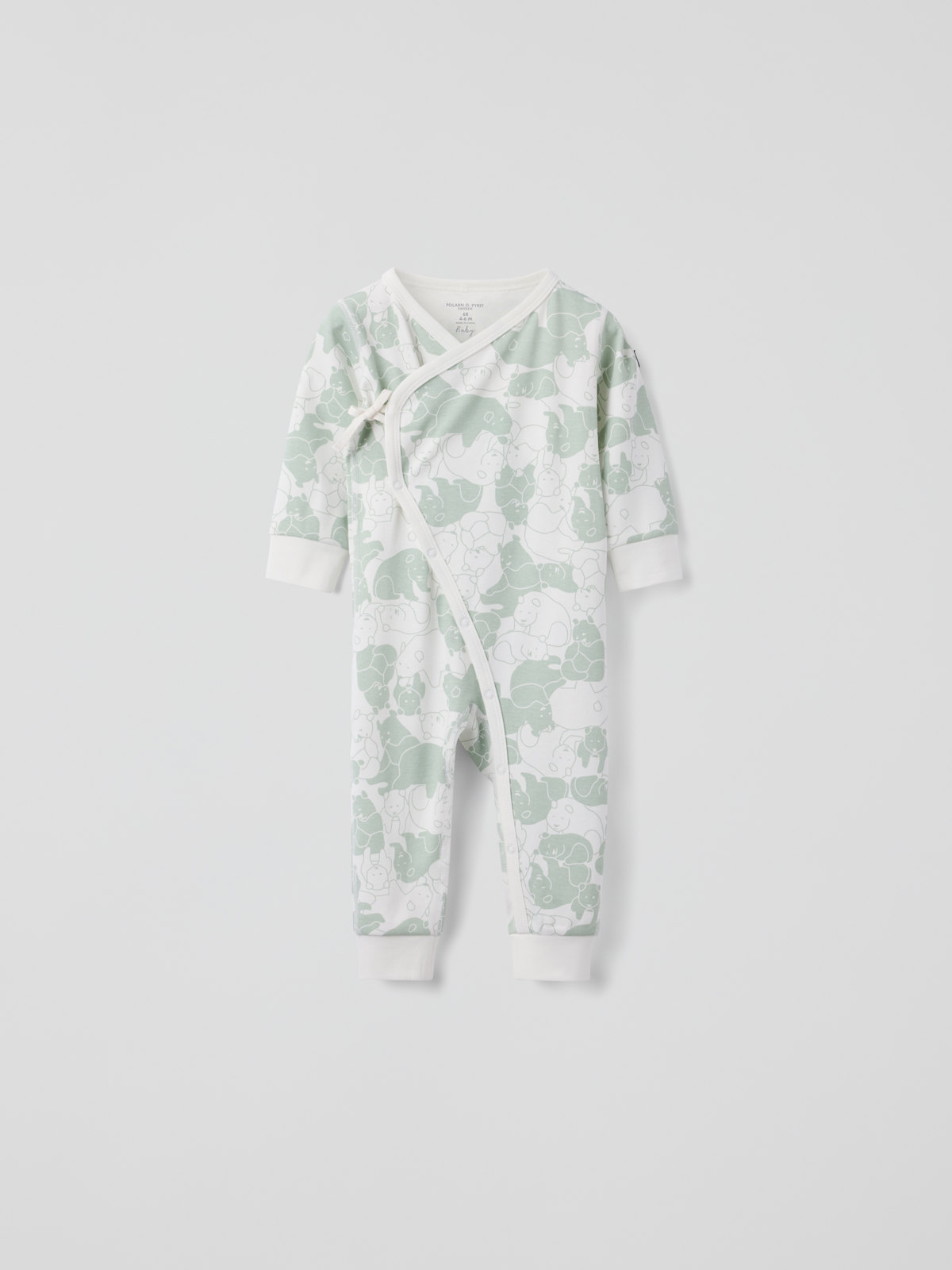 Mjuk och skön omlottoverall i 100 % ekologisk bomull – perfekt för hemmamyset! Overallen är helmönstrad med ekkvistar och sydd med extra mjuka, platta sömmar som är skonsamma mot känslig hud. Muddarna i ärm- och benslut är nedvikbara. I ärmsluten finns också övervikbart tyg som skyddar små händer från kyla och riv. Under ärmen har overallen ett fint band som går att knyta i en rosett.