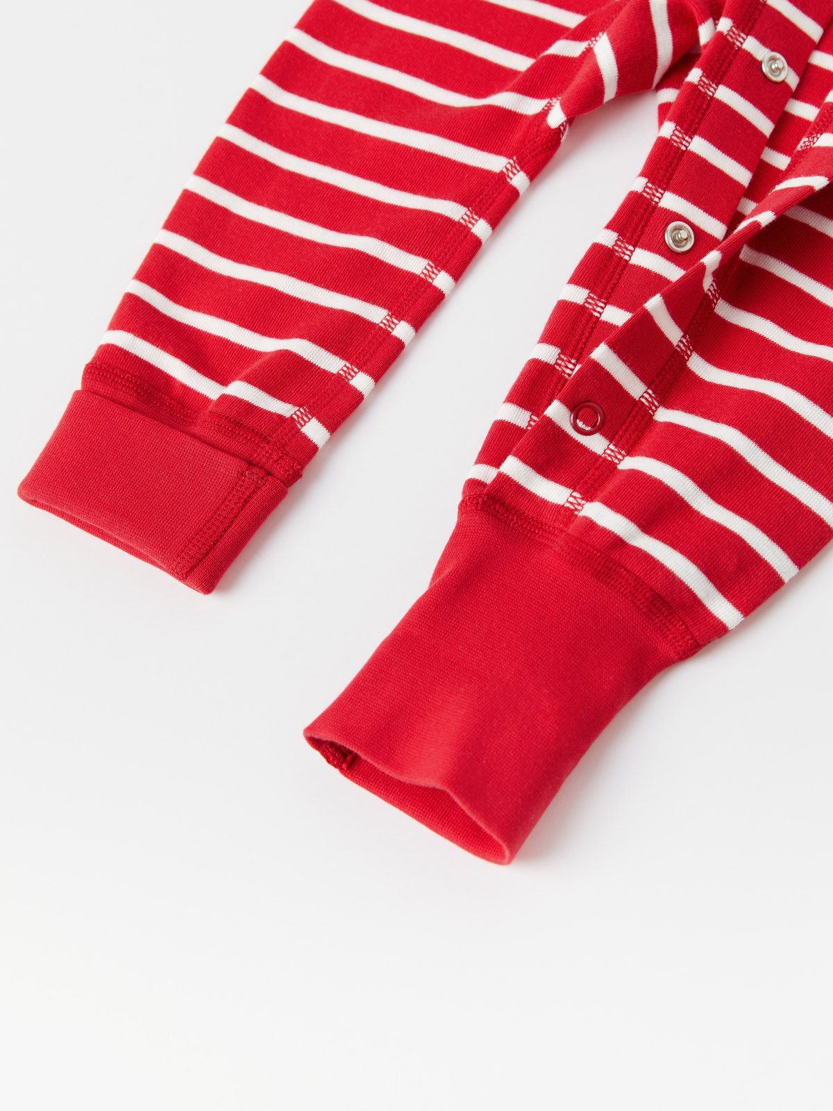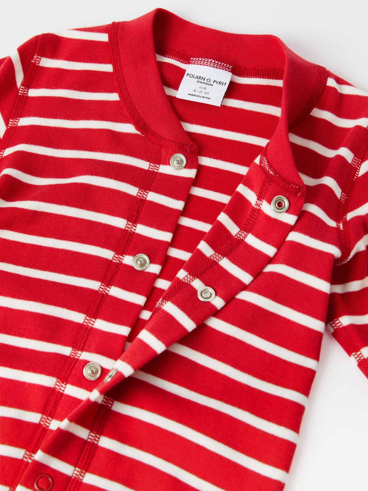 En randig overall för de allra minsta, i 100% ekologisk bomull. Overallen har vår klassiska rand och tryckknappar från hals till benslut som gör den lätt att ta på och av. Muddarna är extra långa och går att vika ned när barnet växer.