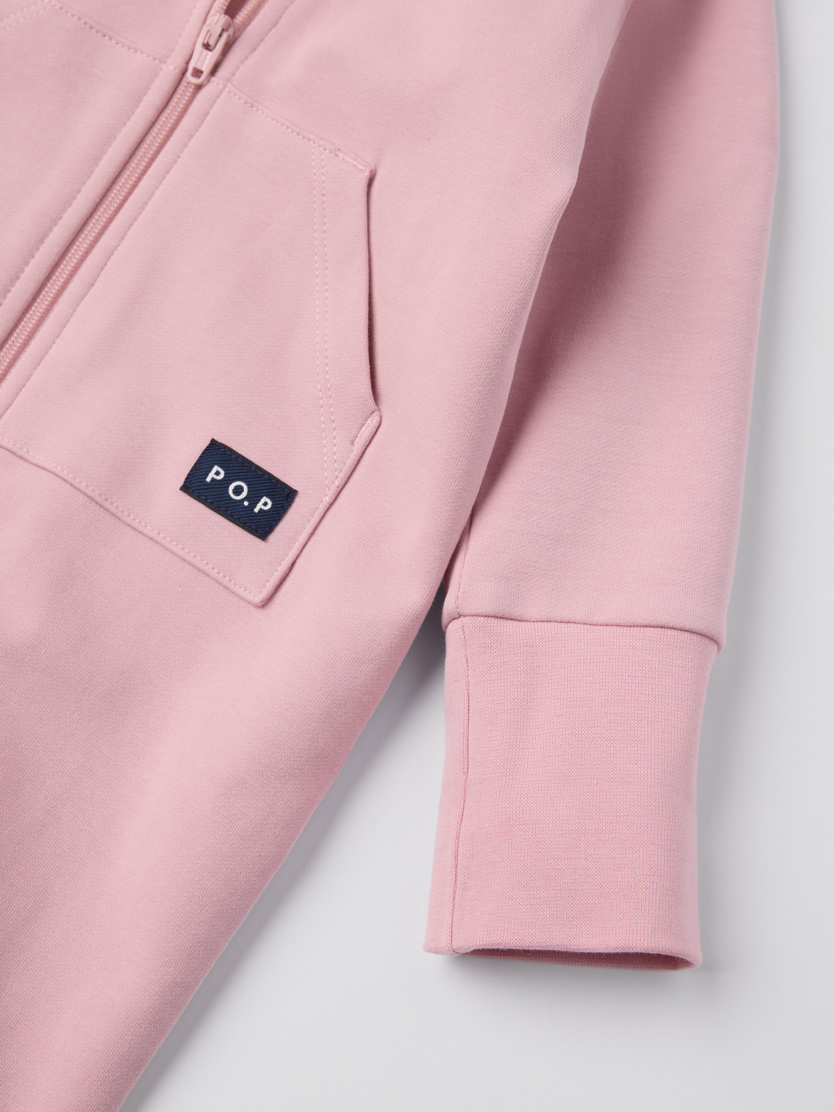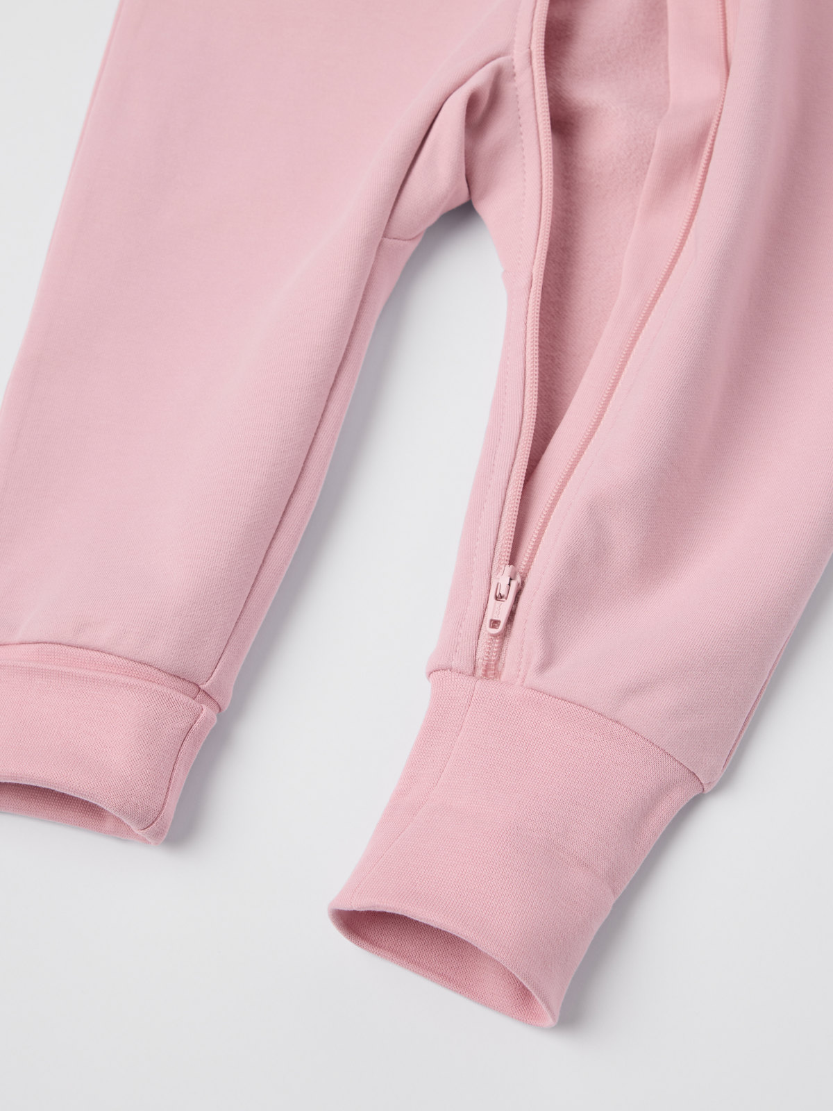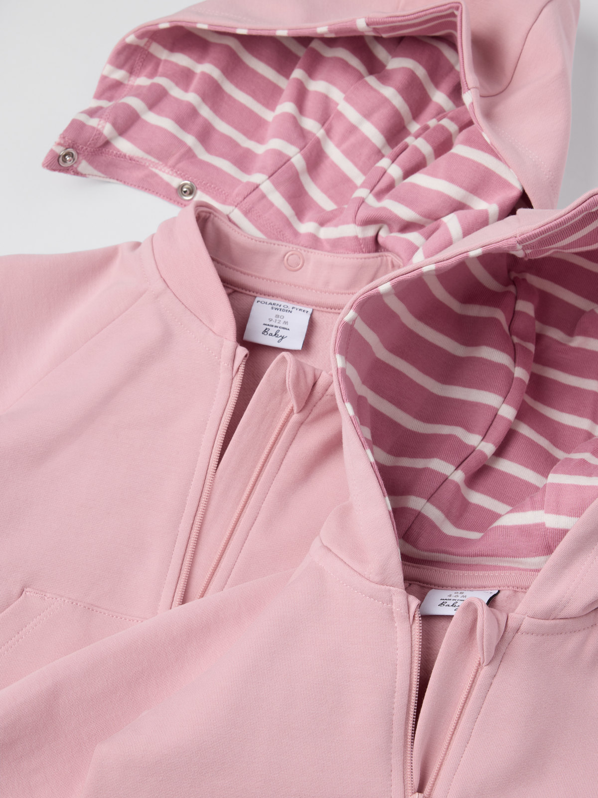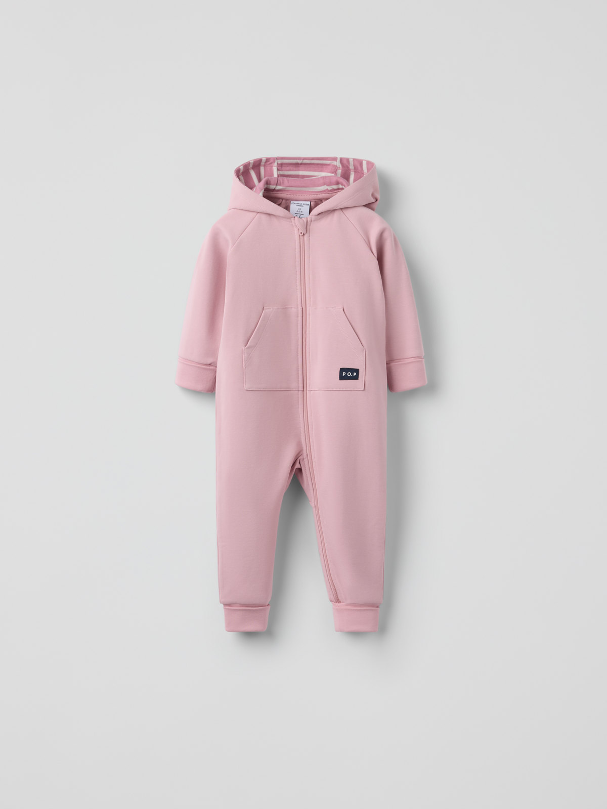 Mjuk overall i ekologisk bomull med skön sweatshirtkvalitet och borstad insida för baby. Overallen har en känguruficka och fast huva som är fodrad med mjuk bomullstrikå med vår klassiska rand. Den långa dragkedjan från hals till benslut underlättar klädbyten och har ett skydd högst upp för att inte skava mot haka och kind. Overallen har extra långa, ribbade muddar vid ärm- och benslut, som går att vika ned allt eftersom barnet växer.