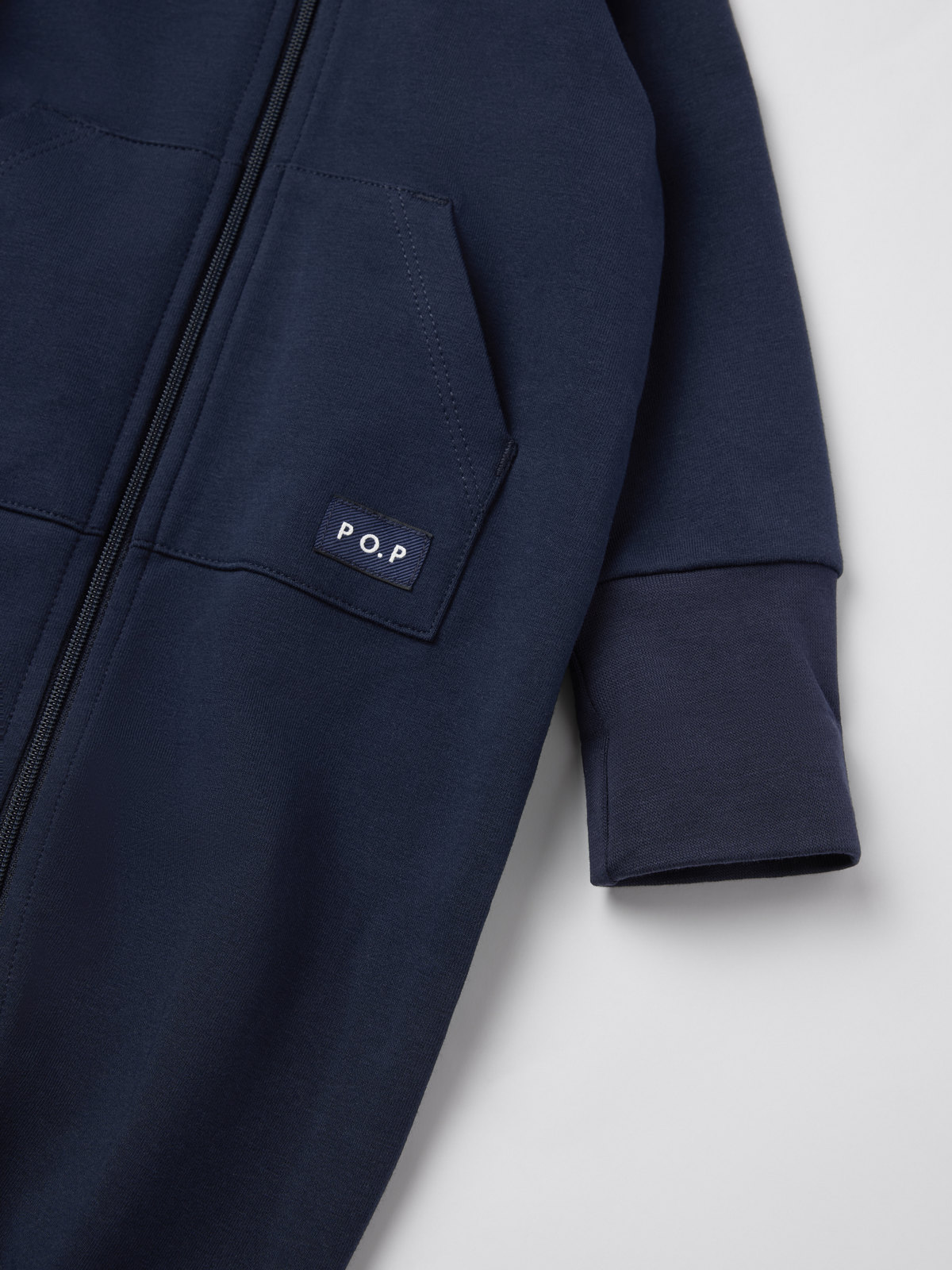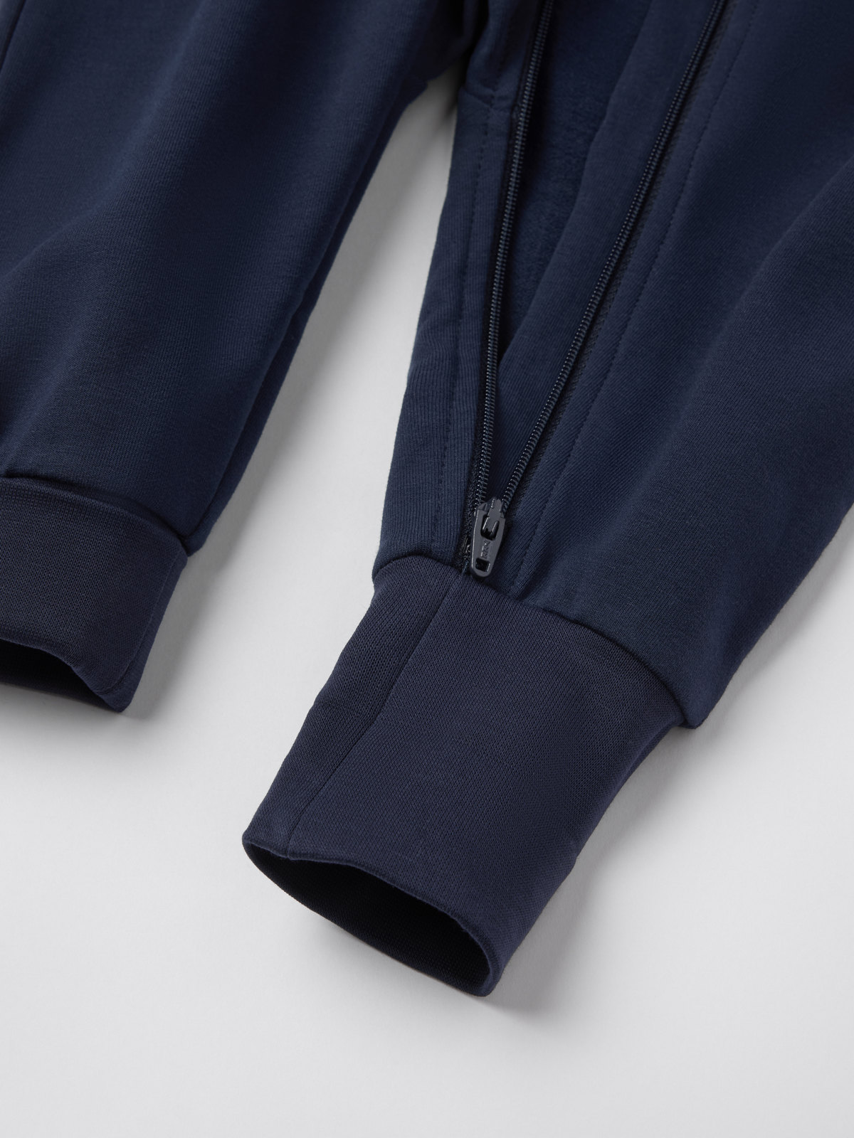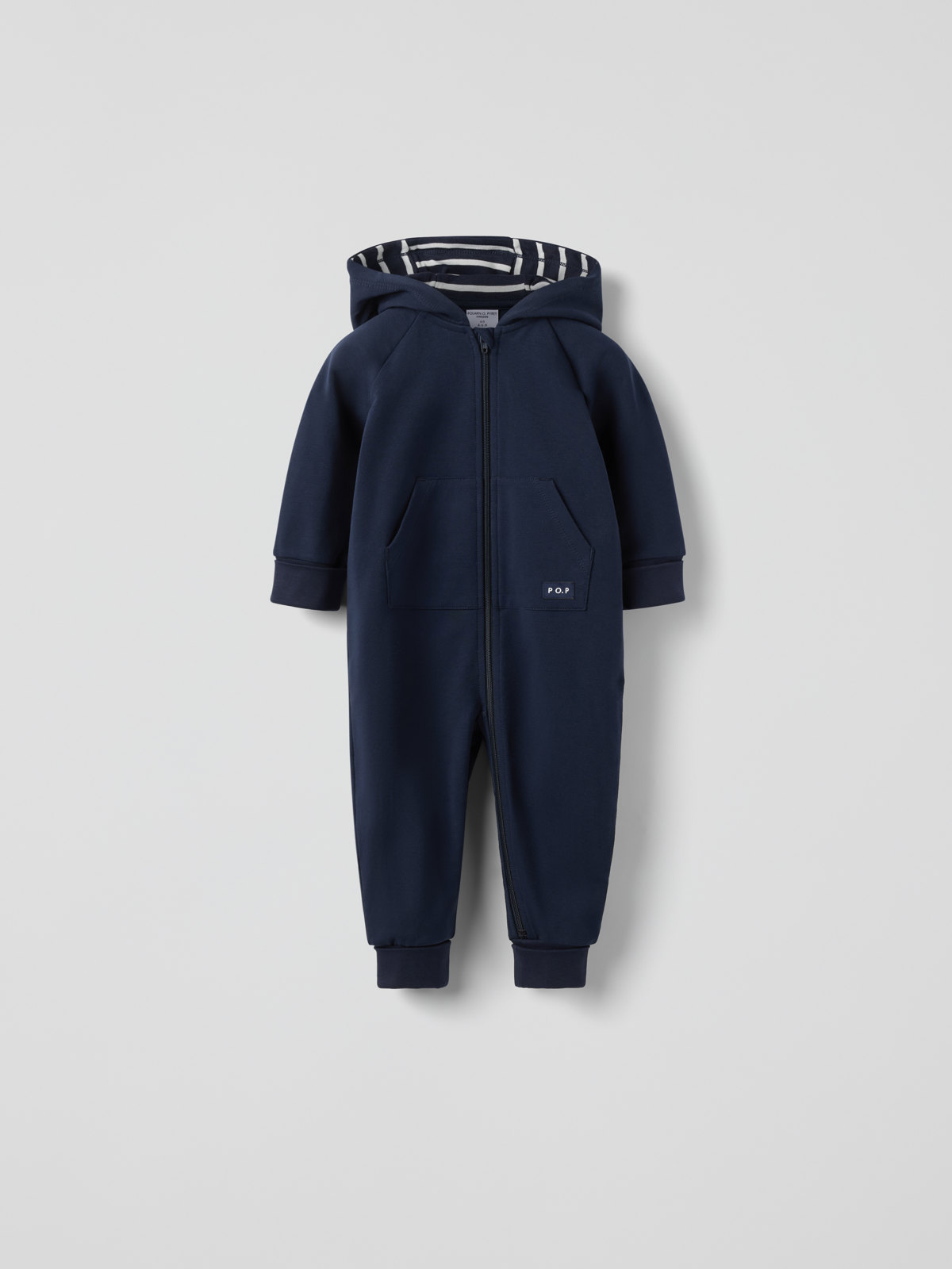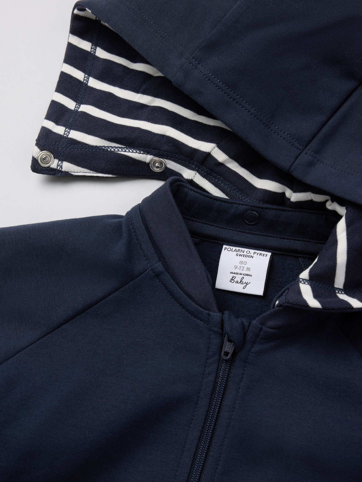 Mjuk overall i ekologisk bomull med skön sweatshirtkvalitet och borstad insida för baby. Overallen har en känguruficka och fast huva som är fodrad med mjuk bomullstrikå med vår klassiska rand. Den långa dragkedjan från hals till benslut underlättar klädbyten och har ett skydd högst upp för att inte skava mot haka och kind. Overallen har extra långa, ribbade muddar vid ärm- och benslut, som går att vika ned allt eftersom barnet växer.