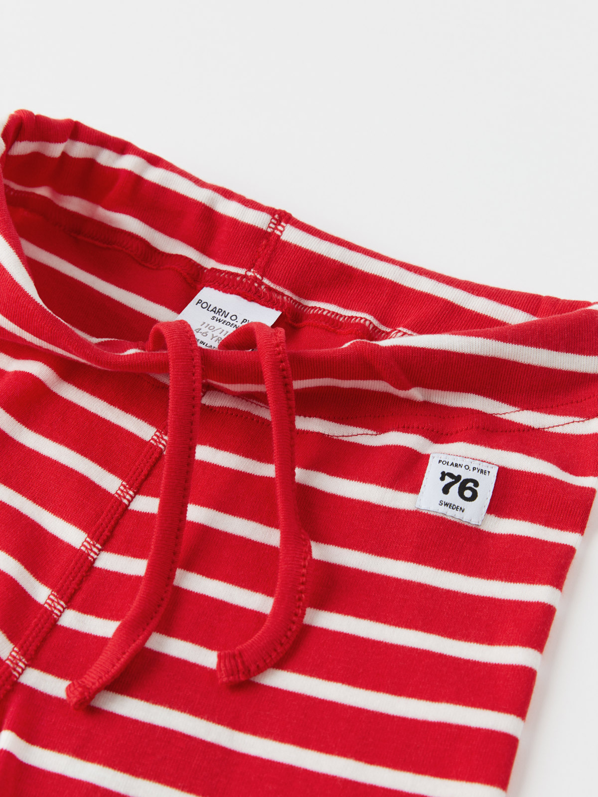 Ett par randiga byxor i 100% ekologisk bomull. Byxorna har vår klassiska rand och elastisk midja som går att justeras med knytband. Byxorna har även mjuk elastiska muddar vid bensluten.