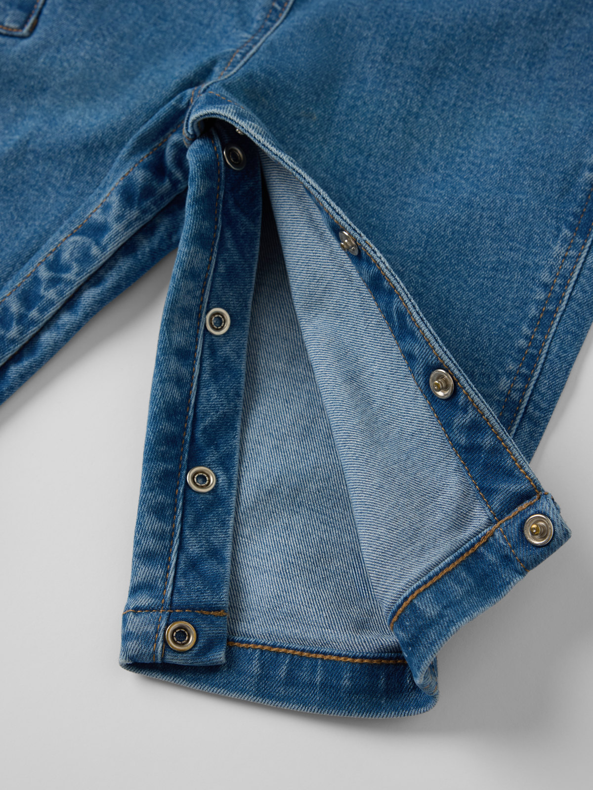 Hängselbyxa i mjuk och stretchig denim för baby – perfekt i vårvädret! Byxan har hängslen som stängs med knappar fram och raka ben.