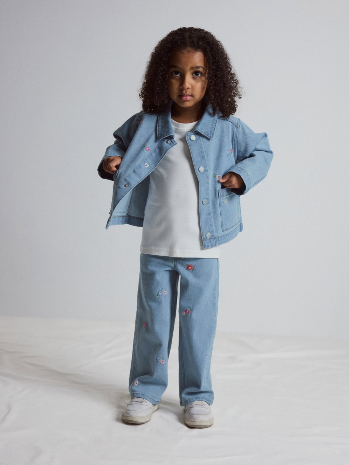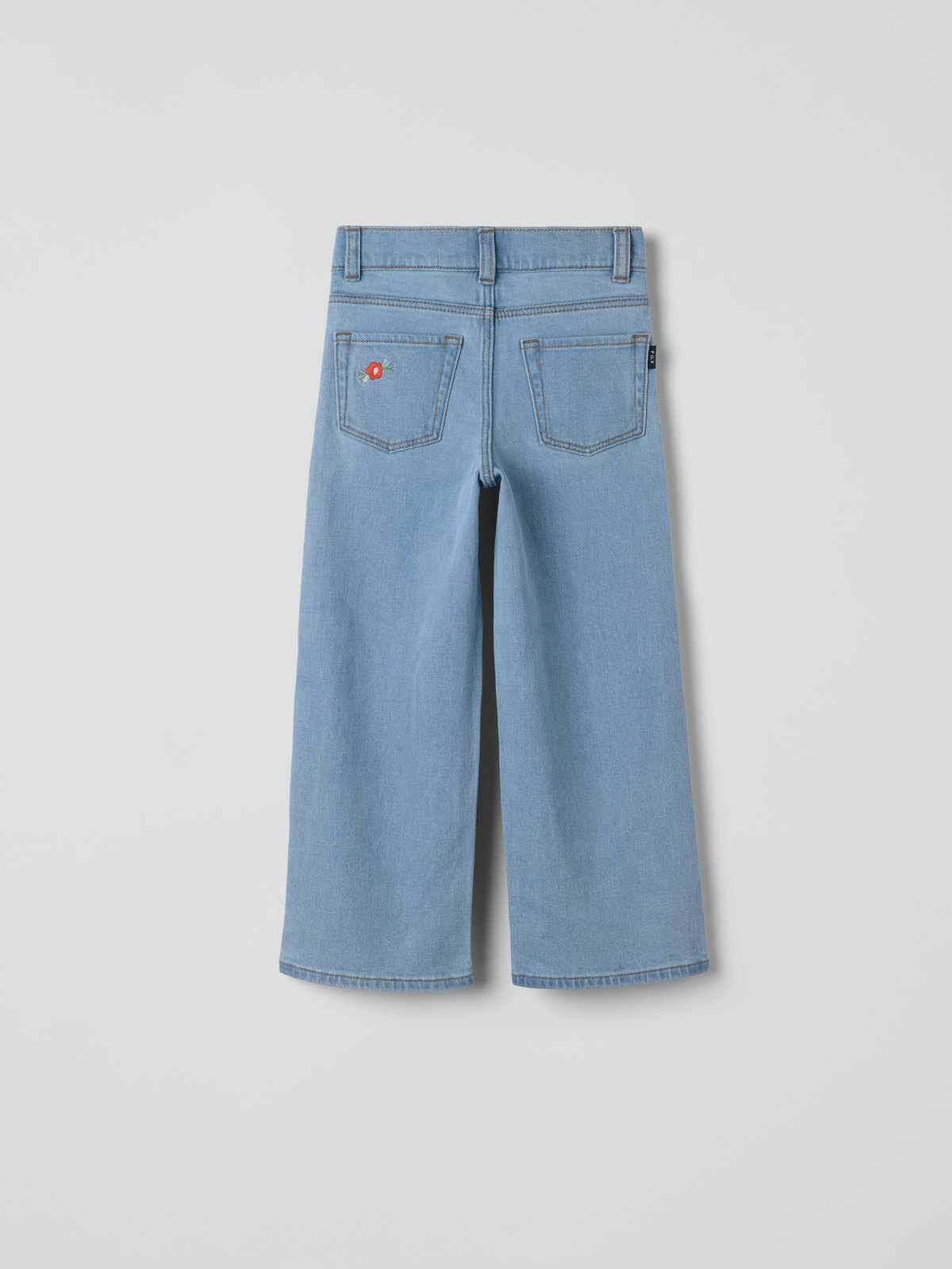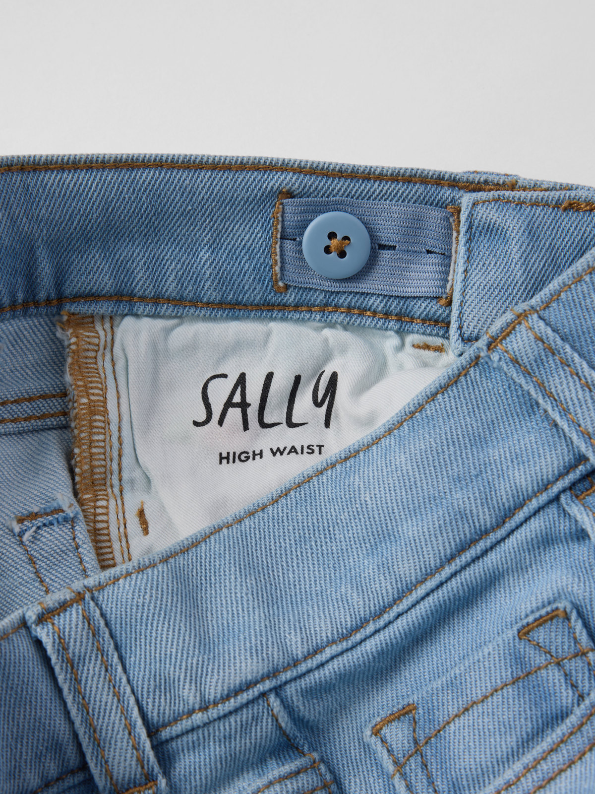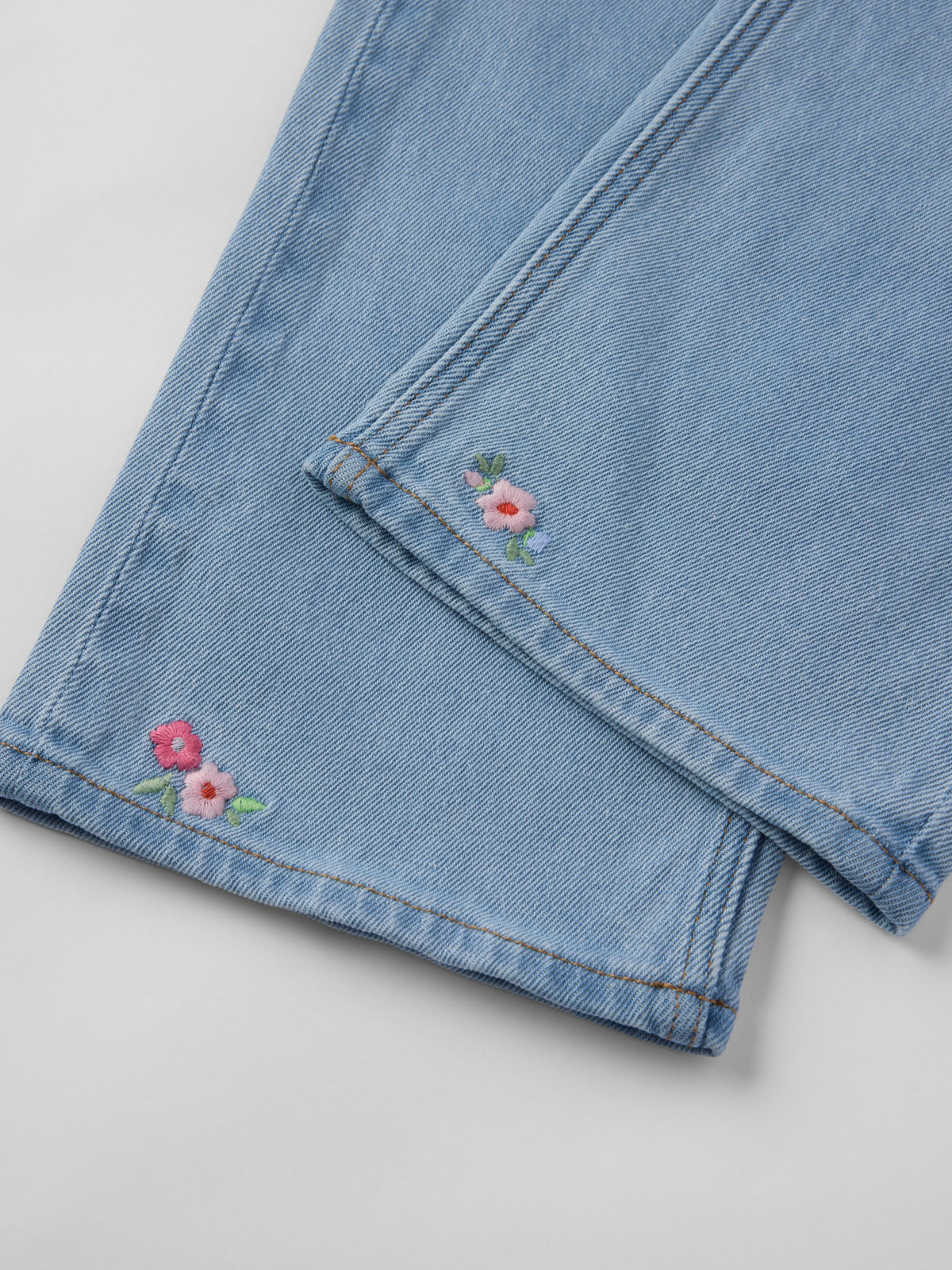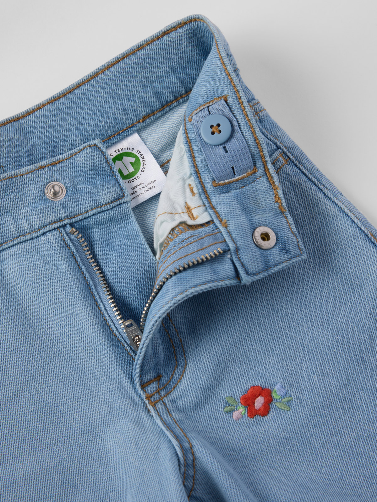 Våra stilsäkra jeans SALLY, tillverkade i mjuk denim med söta broderier. En lekvänlig byxa i mjuk stretch med vida ben och hög midja. Alla våra jeans är från våren 2022 tillverkade i GOTS-certifierad bomull.