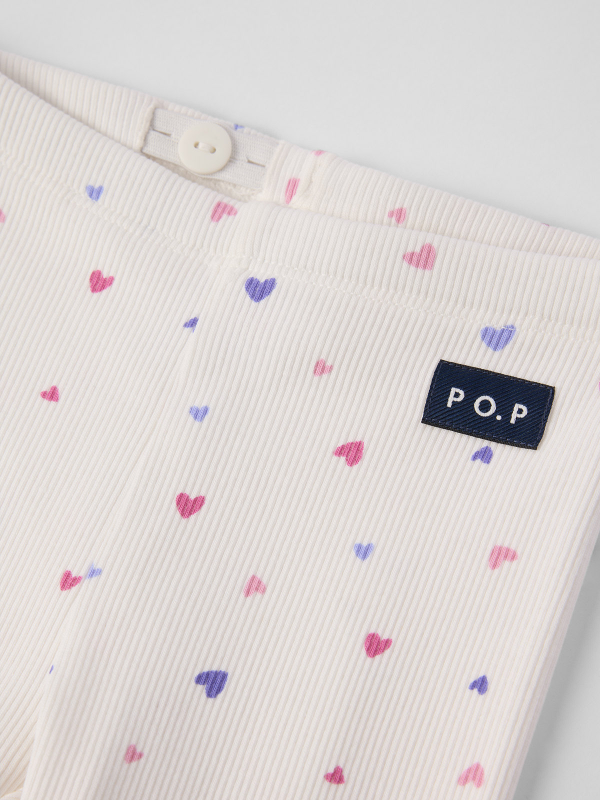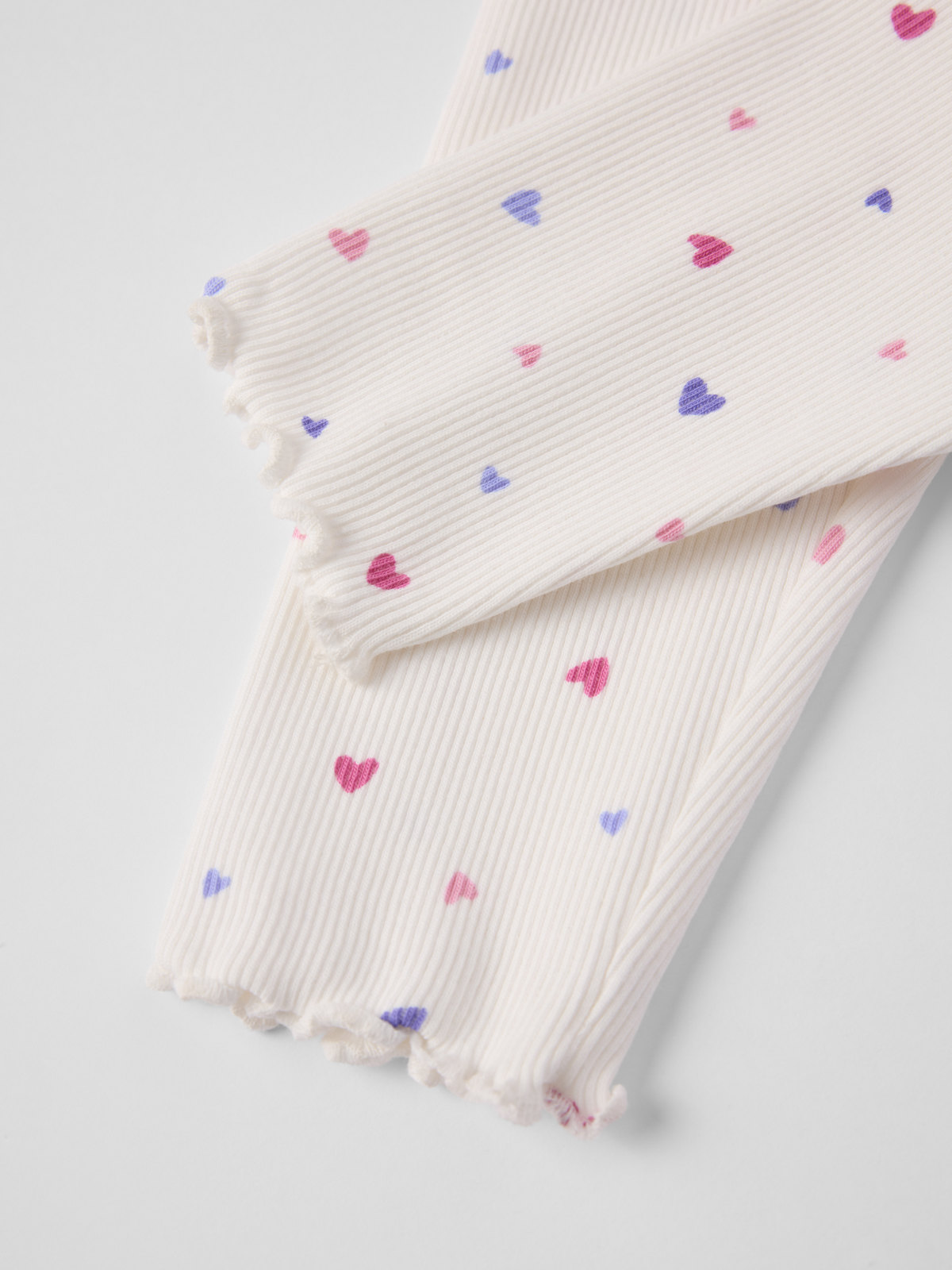 Ribbstickade leggings i mjuk ekologisk bomull för baby. Leggingsen har elastisk midja som går att justera med knapphålsresår, och krusad uddkant vid benslut.