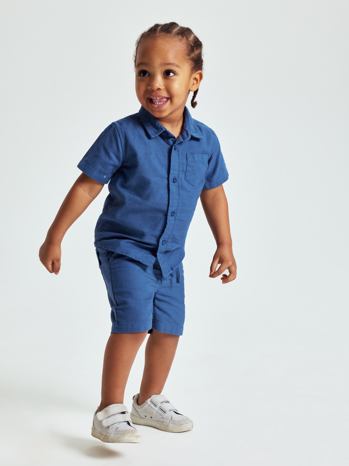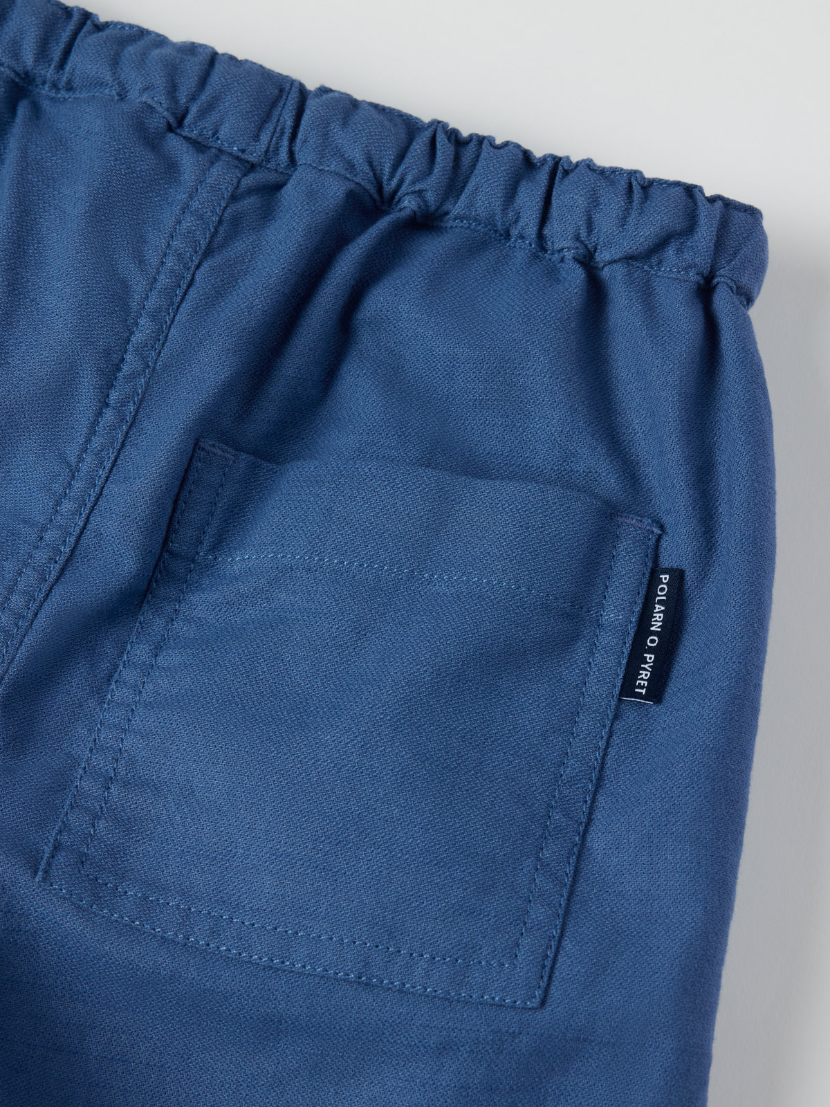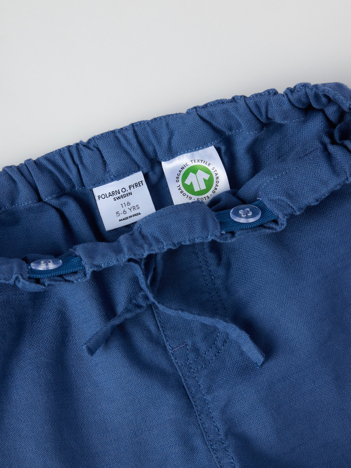 Enfärgade shorts i tunn ekologisk bomull med linnekänsla – sköna både till vardag och fest. Shortsen har elastisk midja som går att justera med knytband, samt två fickor fram.
