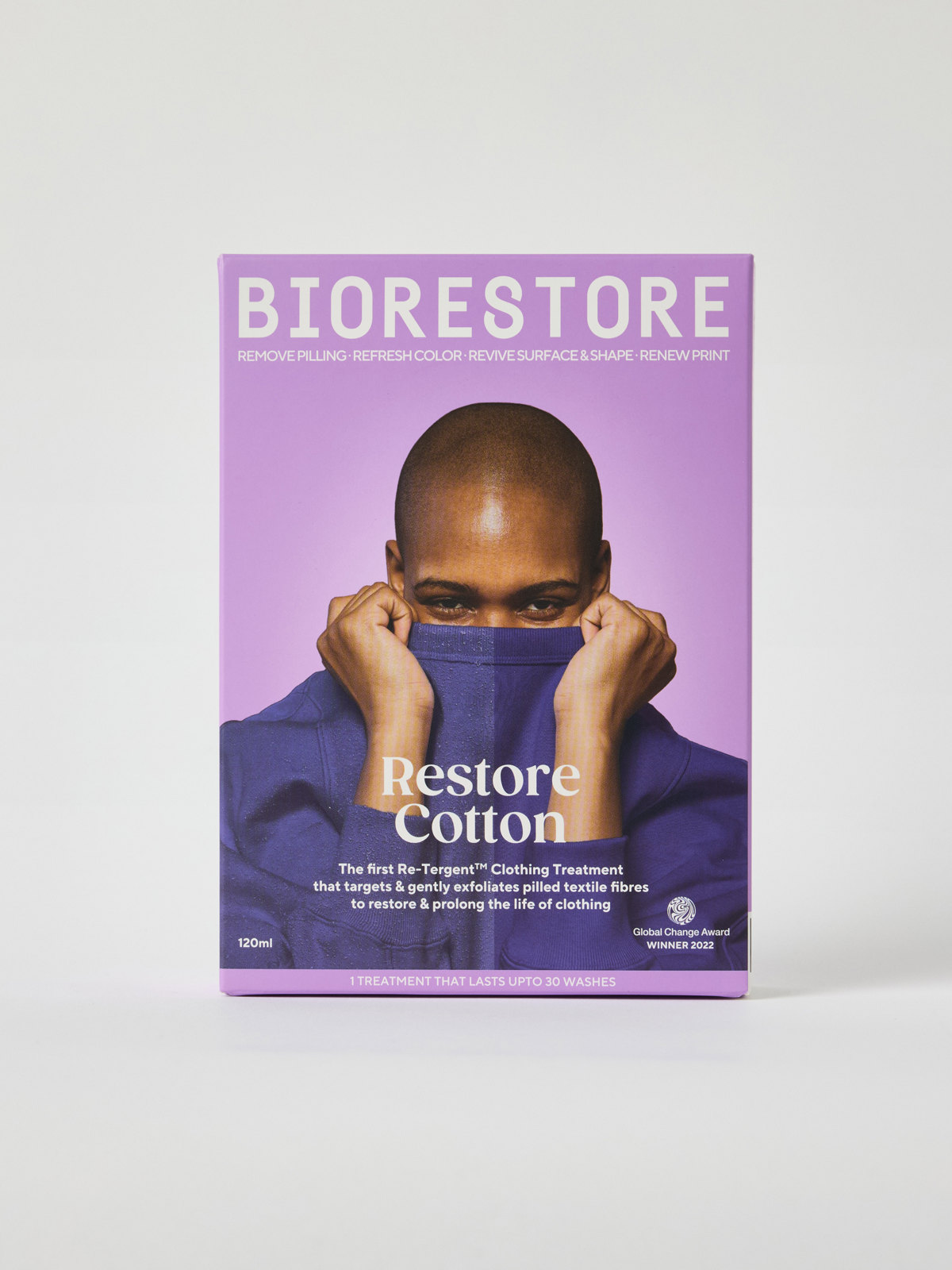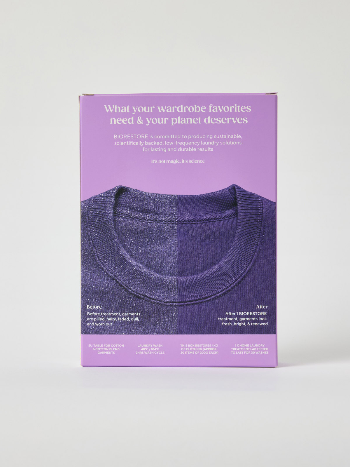 Ny formula – ge nytt liv åt hela 4 kg kläder! Biorestore är ett enzym-medel som tillsammans med vatten och tvättmaskinens rörelser återställer och fräschar upp färg, förnyar tryck och jämnar ut klädernas yta. En enkel behandling gör dina favoritplagg* som nya igen.