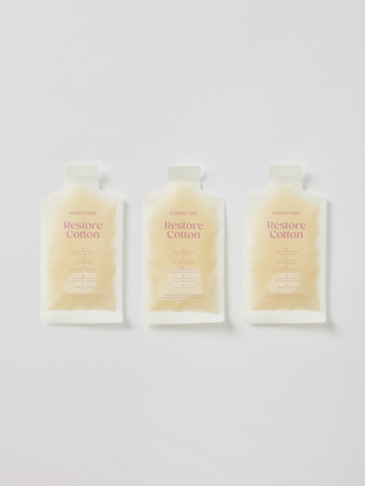 • Paketet innehåller 3 påsar Biorestore med 40 ml i varje. En påse räcker till ca 1,35 kg kläder, hela paketet räcker till 4 kg. En body i storlek 56 väger 65 gram. En långärmad tröja i storlek 92 väger 90 gram/135 gram i storlek 128. En byxa i storlek 92 väger 70 gram/115 gram i storlek 128. (Som viktexempel har vi använt våra klassiska randiga plagg.)