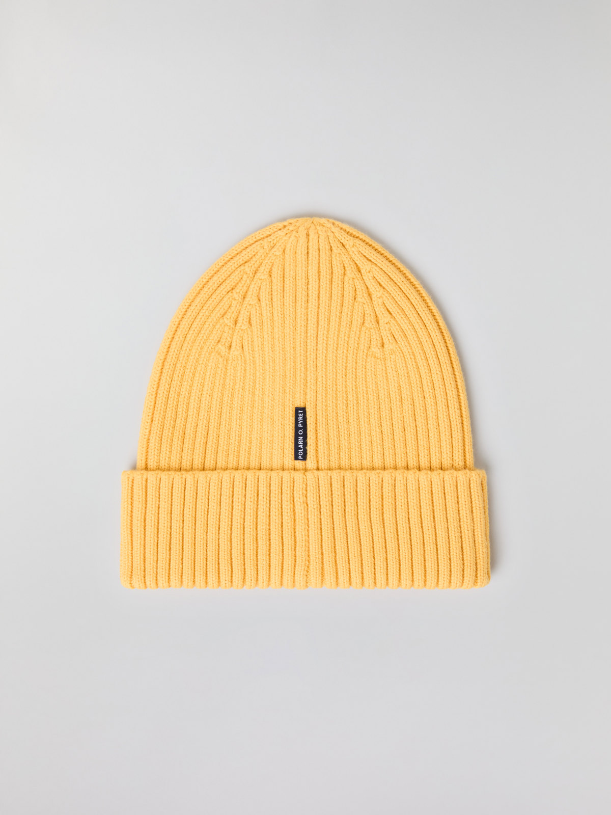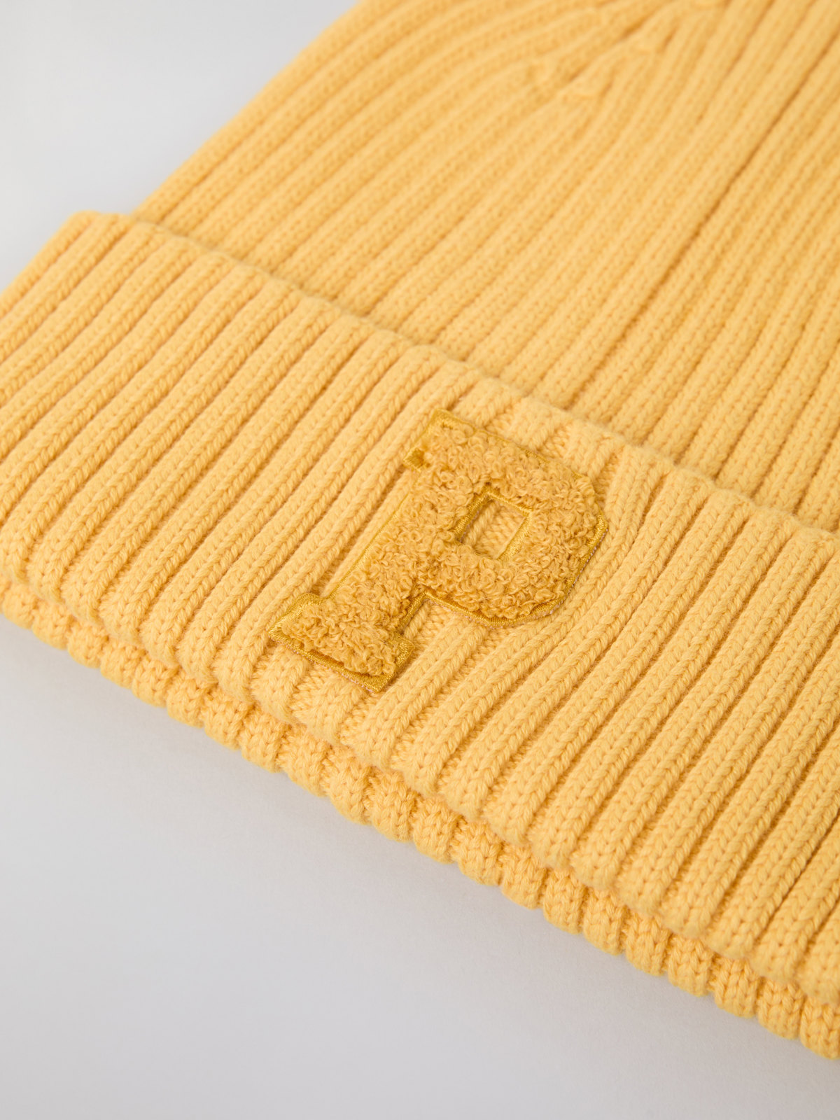 Ribbstickad mössa i ekologisk bomull – perfekt för småkyliga höst- och vårdagar. Mössan har ett uppvik i nederkant och en P-applikation fram.