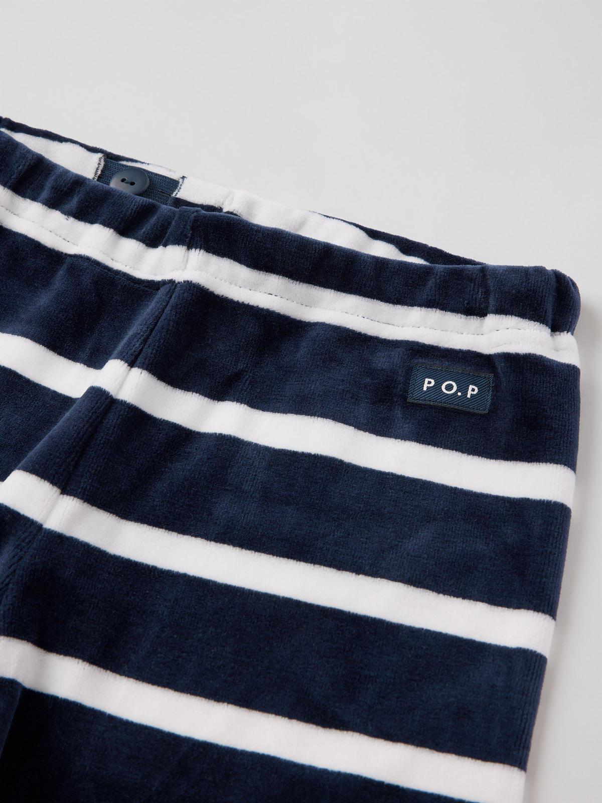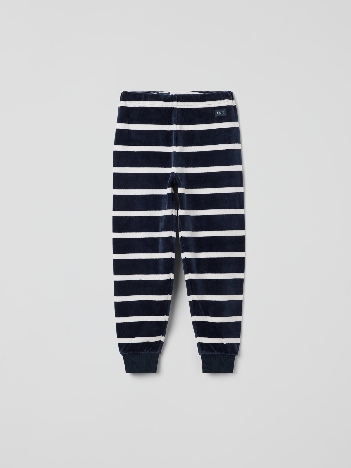 Riktigt mjuk och gosig byxa i velour tillverkad av ekologisk bomull och återvunnen polyester. En vinterfavorit att älska länge! Byxan har ribbad mudd i benslut och midjan går att justera med knapphålsresår.