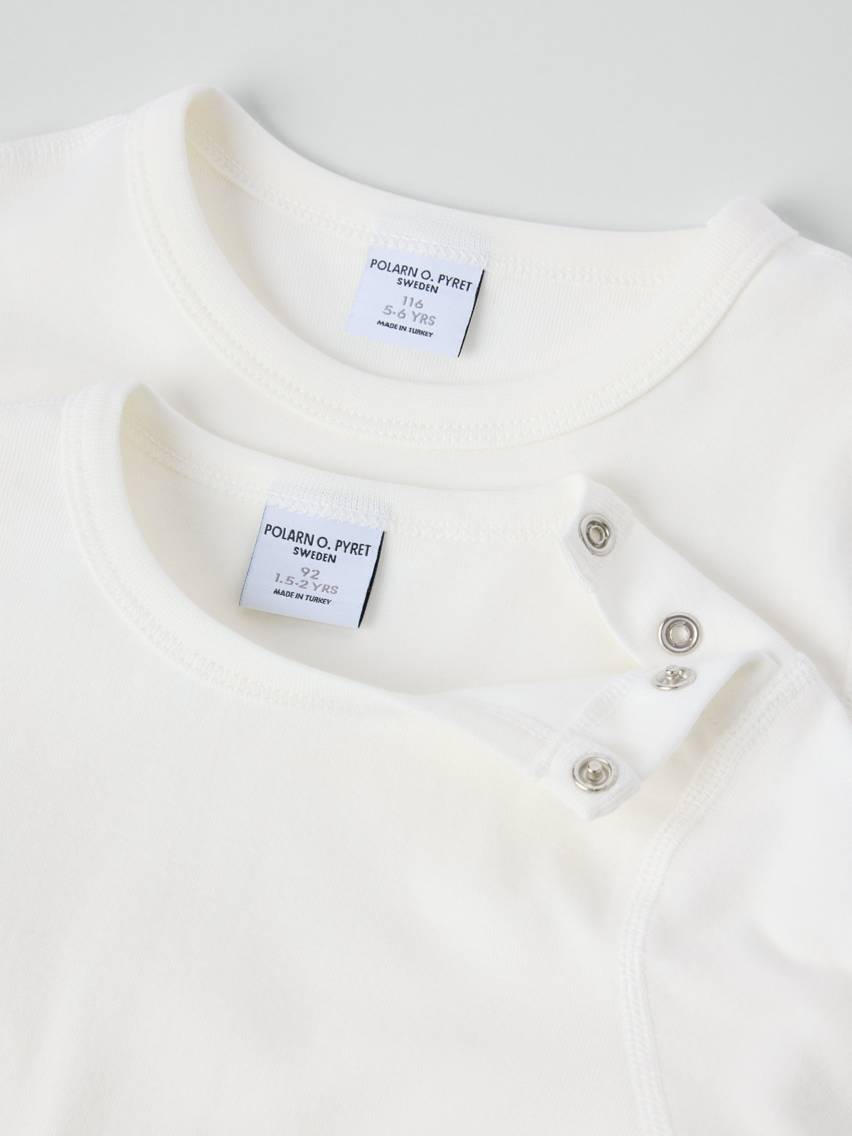 Storlekarna 86-92 har tryckknappar på ena axeln för att underlätta klädbyten.
