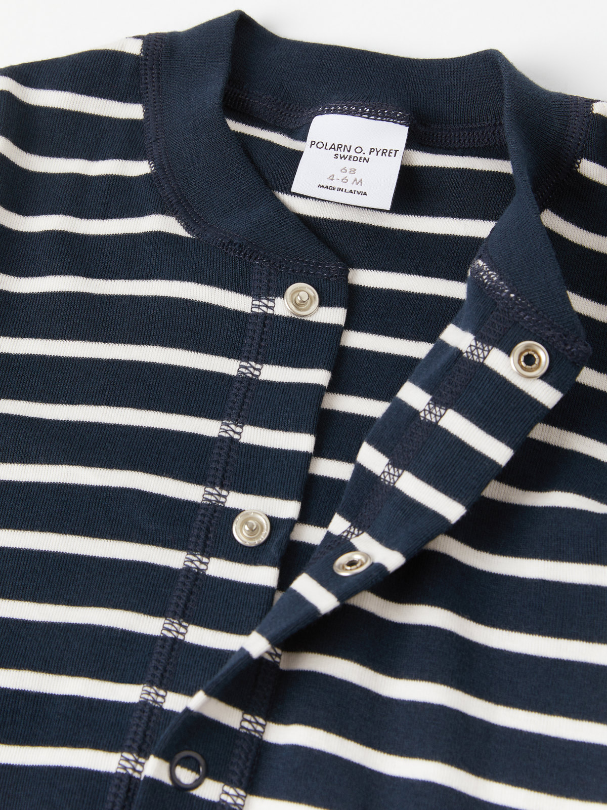 Vår klassiska randiga overall i mjuk ekologisk bomull – perfekt som både pyjamas och mysplagg! Overallen är sydd med extra mjuka, platta sömmar som är skonsamma mot känslig hud. Muddarna vid ärm- och benslut är extra långa och går att vika ned allteftersom barnet växer. Den långa knappslån från hals till benslut underlättar klädbyten.