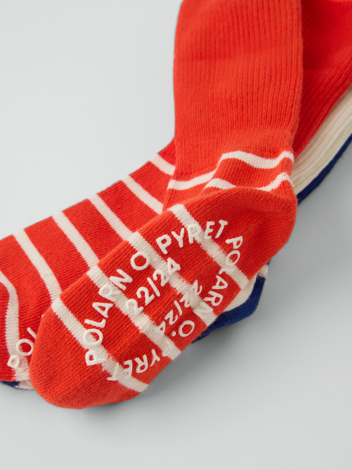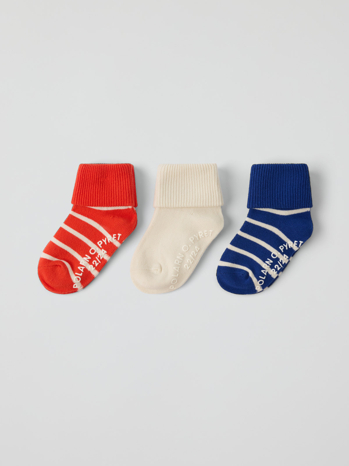Fyll på strumplådan med tre par randiga strumpor i ekologisk bomull. Strumporna har mjuk, vikbar mudd som inte skaver och håller dem på plats. Färgerna matchar snyggt med hela kollektionen.