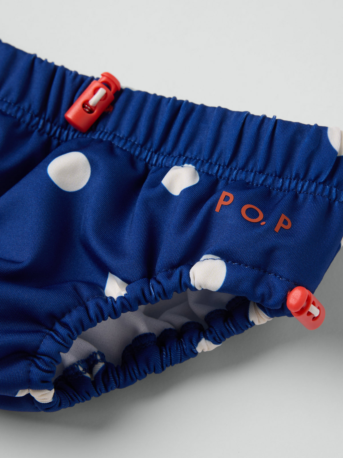 Prickig badblöja i återvunnet material – perfekt för babysim eller badutflykten! Badblöjan har ett extra foder som fångar upp små olyckor och runt benöppningarna finns justerbar resår. Midjan är elastisk och går att reglera på insidan med knytband.