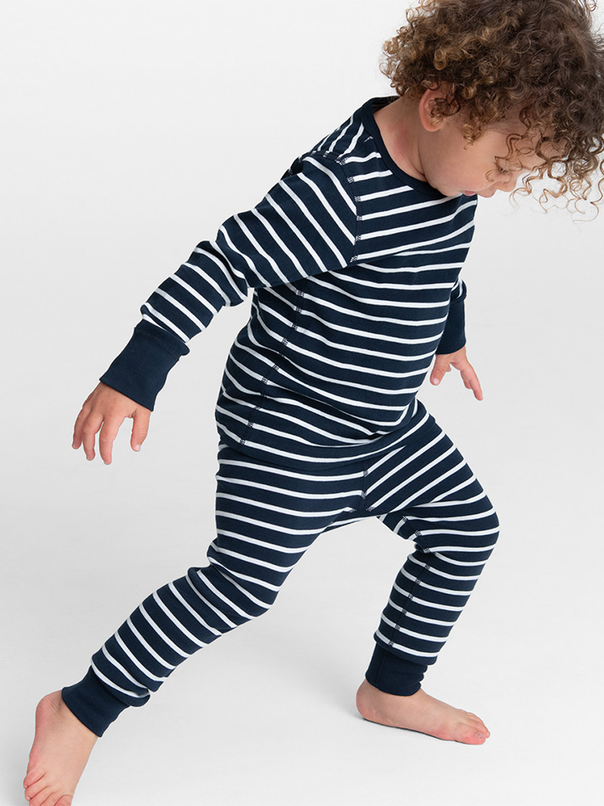 Ett par randiga byxor i 100% ekologisk bomull för baby. Byxorna har vår klassiska rand och elastisk midja som går att justeras med knytband. Byxorna har även mjuk elastiska muddar vid bensluten.