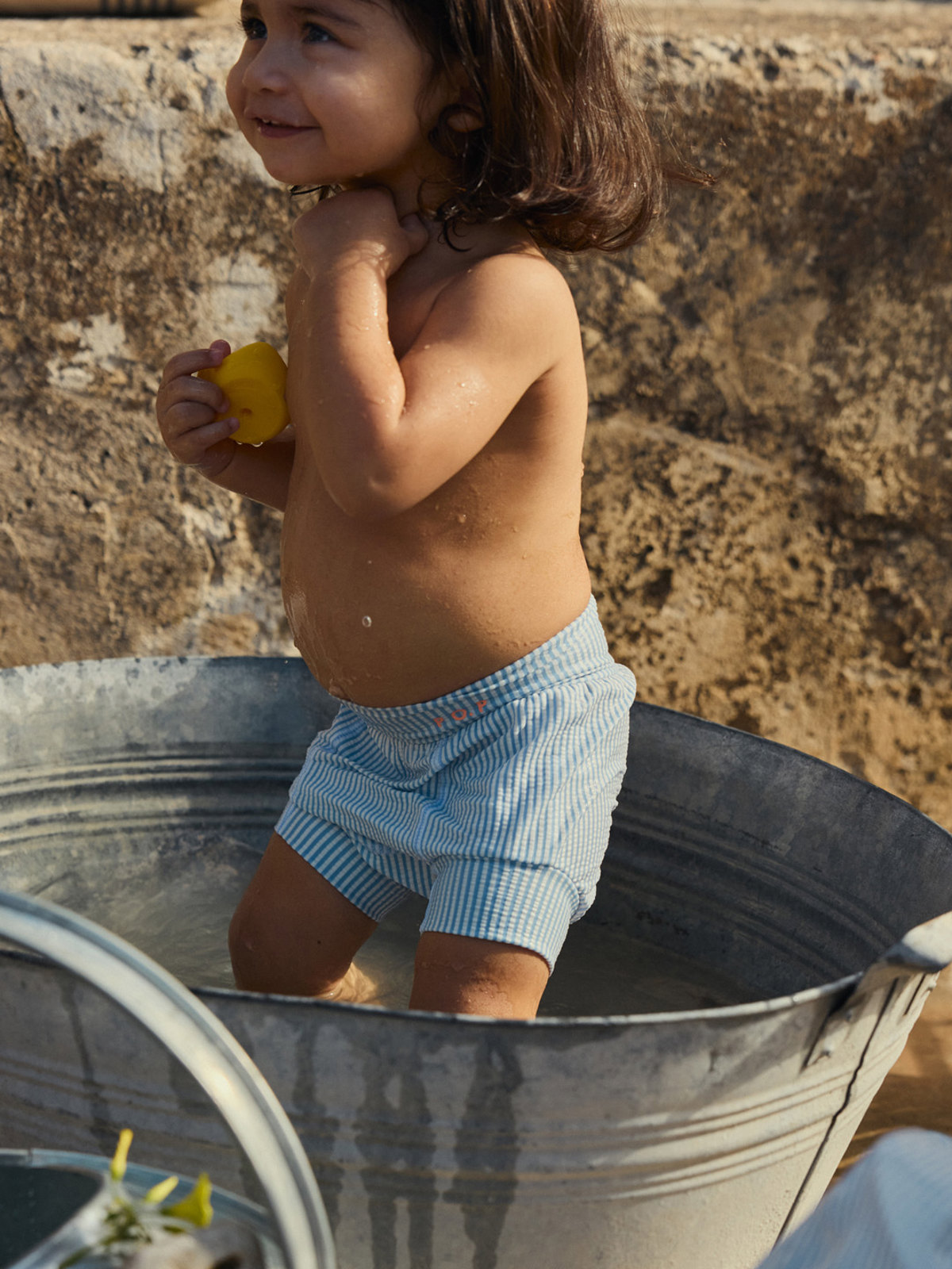 Randig badblöja i mjukt och skönt material av återvunnen polyester – perfekt för babysim eller badutflykten! Badblöjan har bred elastik i midja och vid benöppningarna för skön passform och för att fånga upp små olyckor.