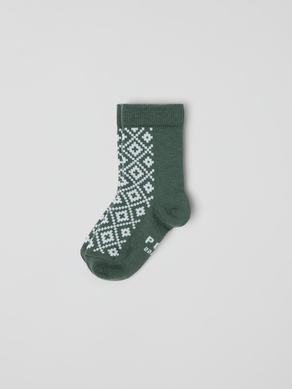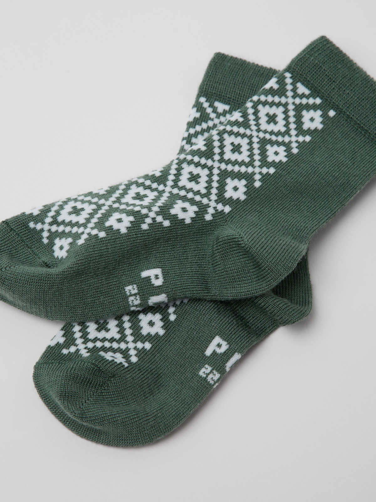 Ett par jaquardmönstrade strumpor i tunn merinoull som värmer gott och är mjuka för små fötter. Storleken är markerad på insidan av skaftet. Där finns också plats att skriva barnets namn. Lätt att hålla ordning!