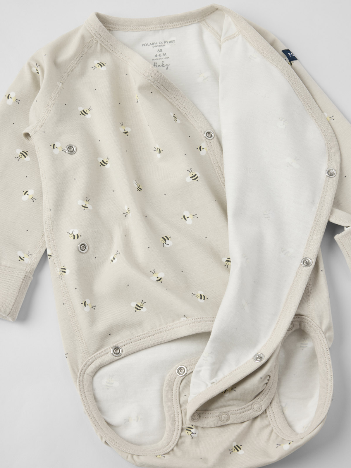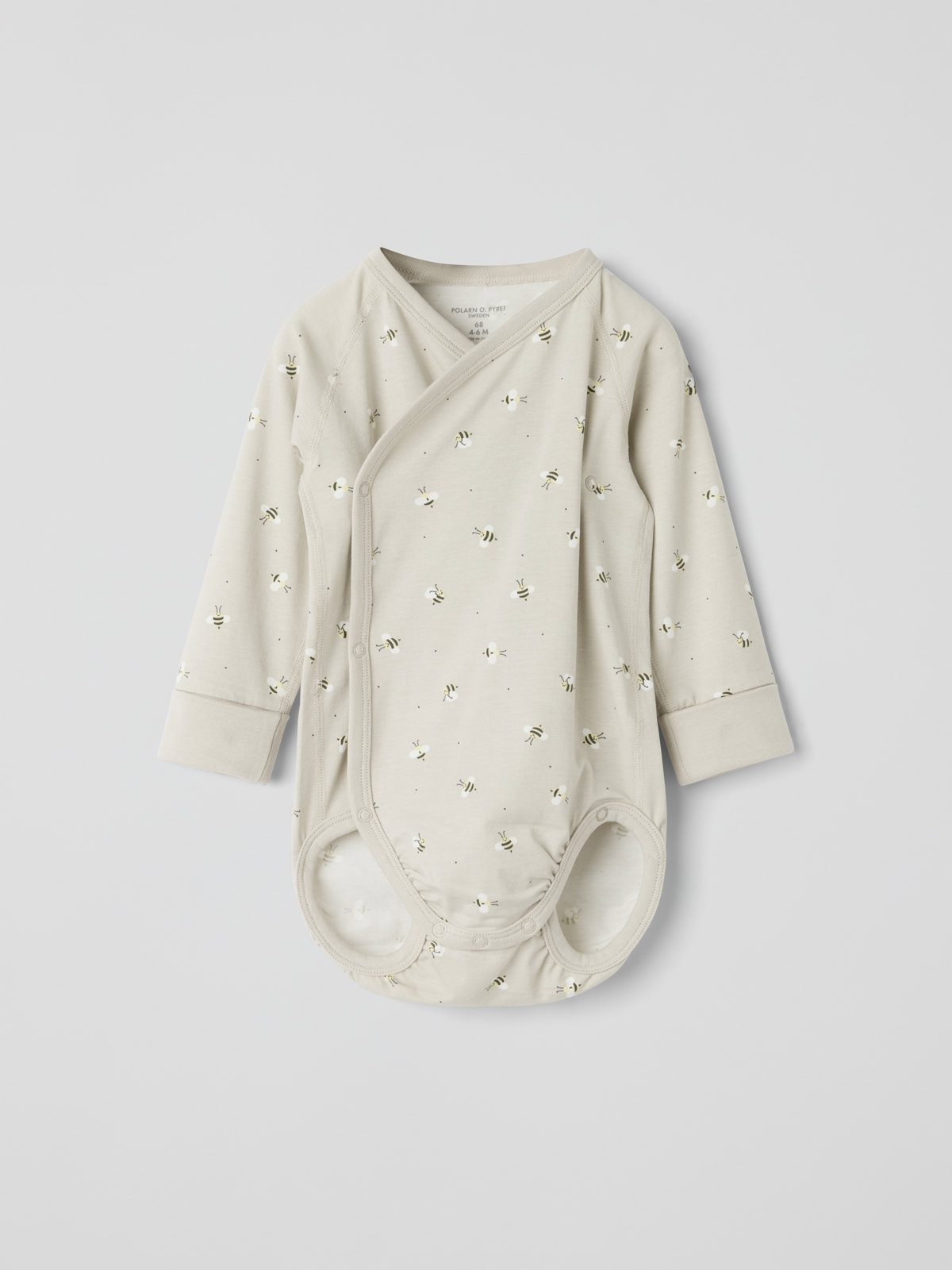 Förlängningsbar omlottbody i ekologisk bomull. Tack vare den smarta lösningen med en extra rad tryckknappar i grenen och nedvikbar mudd vid ärmsluten kan bodyn växa tillsammans med bebisen!