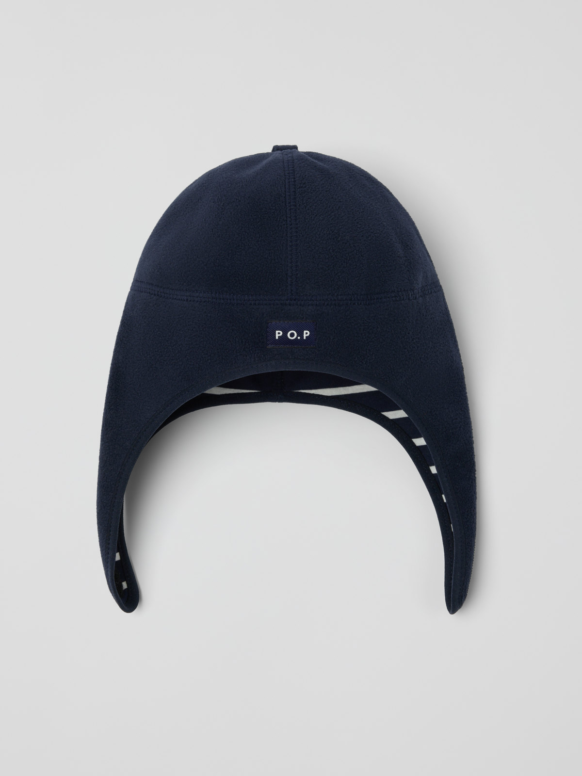 Vindtät och vattenavvisande hjälmmössa i mjuk fleece för baby. Mössan är tillverkad i återvunnen polyester och insidan är fodrad med mjuk ekologisk bomullstrikå med vår klassiska rand. Mössan stängs med kardborreband under hakan.