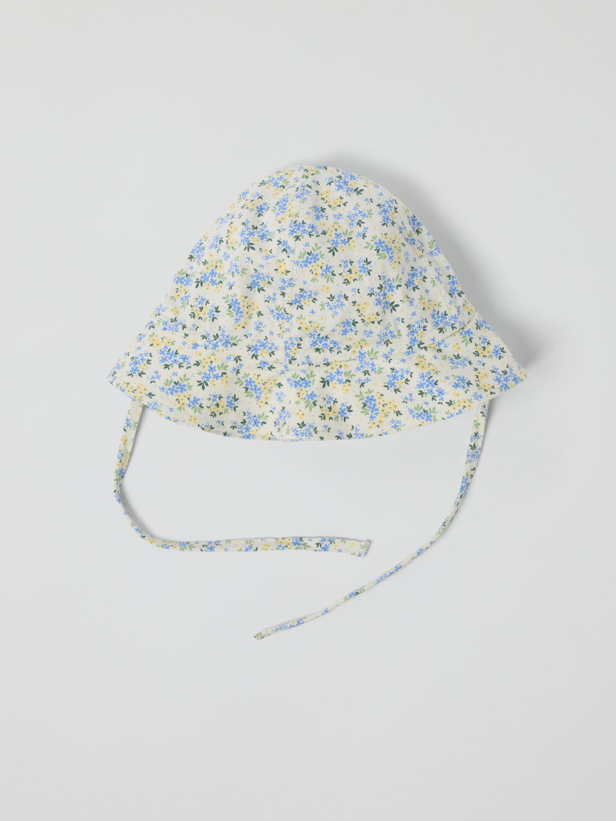 Blommig solhatt i ekologisk bomull – ett måste för de små i solen! Solhatten har ett mjukt knytband som håller den på plats.