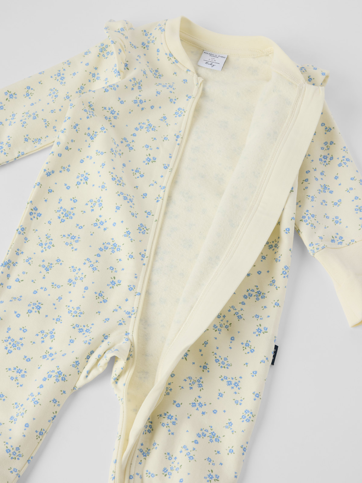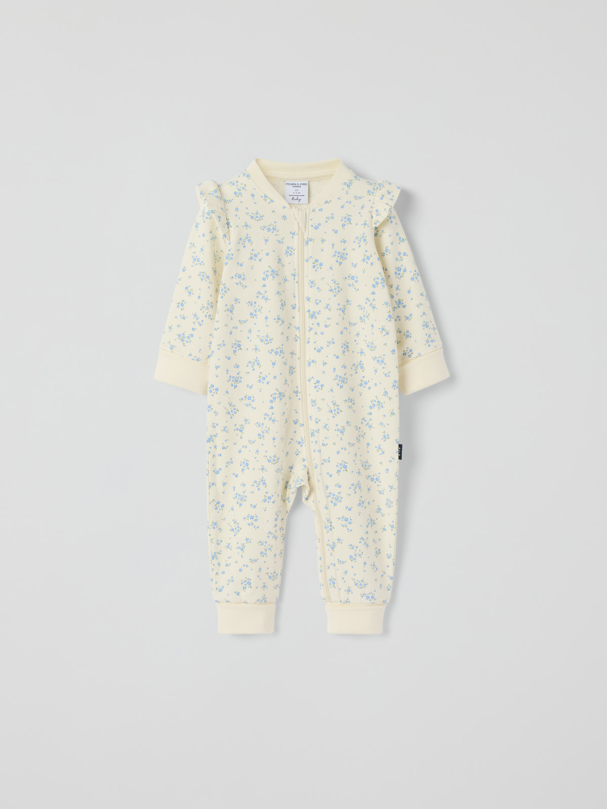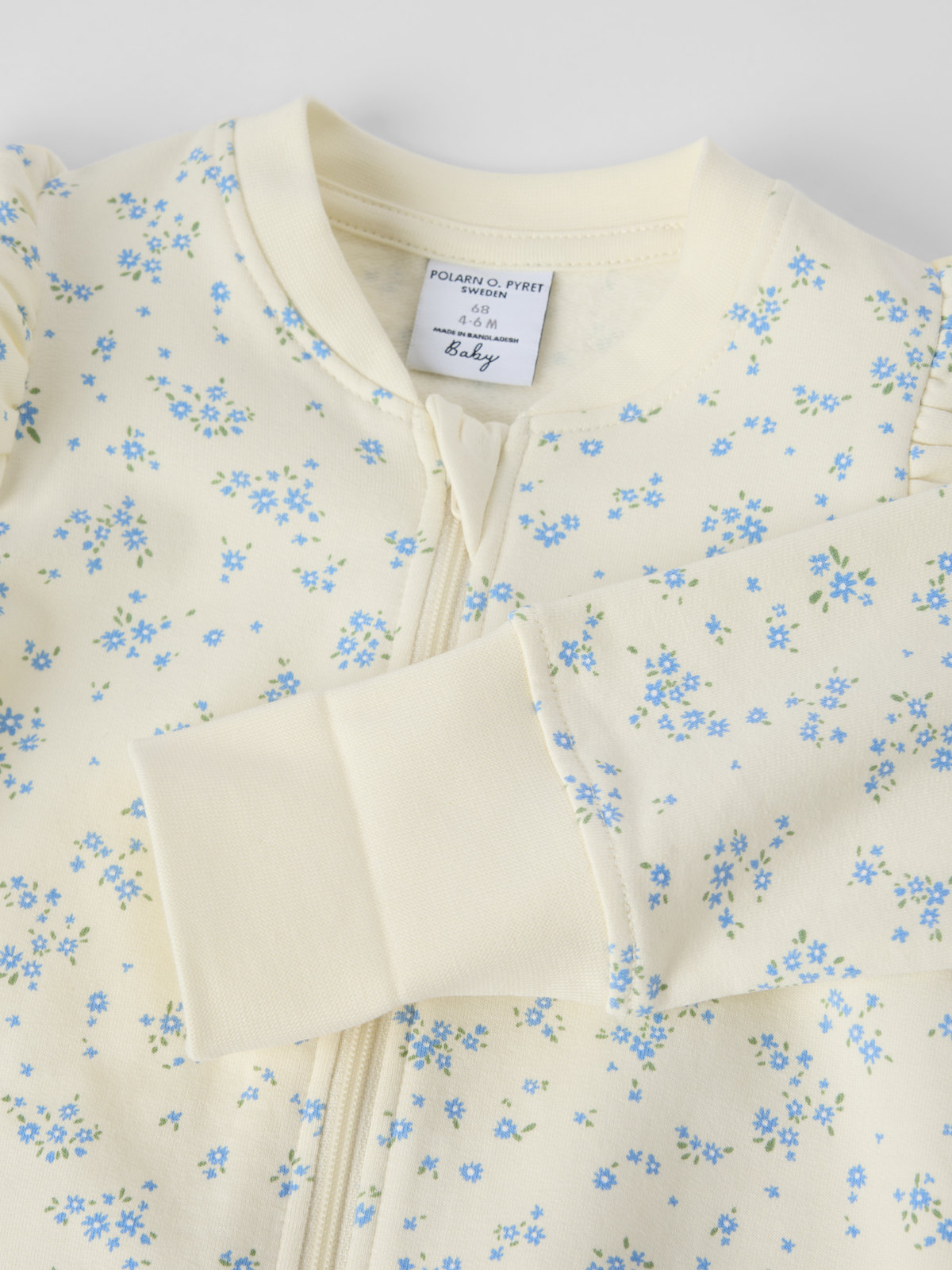 Blommig overall i ekologisk bomull med mjuk sweatshirtkvalitet och borstad insida för baby. Overallen har mjuka muddar vid ärm- och benslut för skön passform och söta volanger över axlarna.