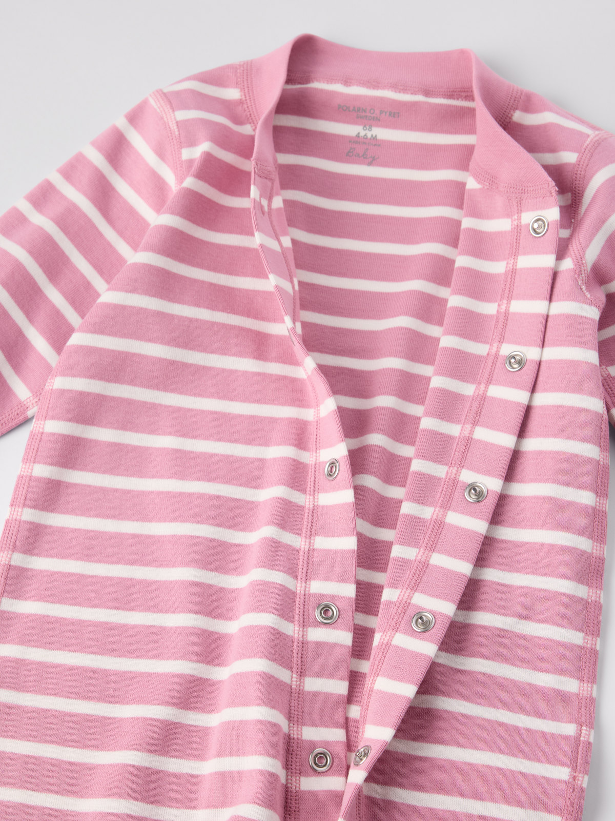 Vår klassiska randiga overall i mjuk ekologisk bomull – perfekt som både pyjamas och mysplagg! Overallen är sydd med extra mjuka, platta sömmar som är skonsamma mot känslig hud. Muddarna vid ärm- och benslut är extra långa och går att vika ned allteftersom barnet växer. Den långa knappslån från hals till benslut underlättar klädbyten.
