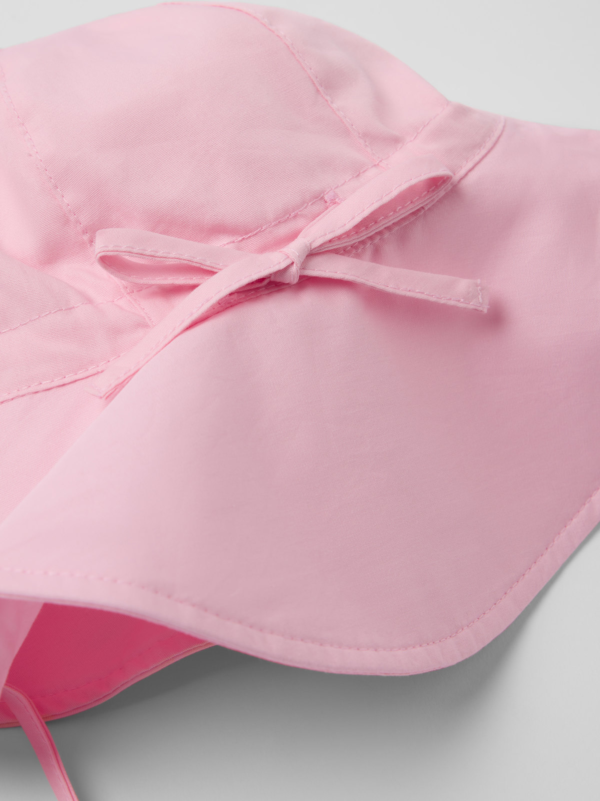 Solhatt i poplin av 100 % ekologisk bomull med UV-skydd UPF 50 – ett måste för de små i solen! Solhatten har ett band kring huvudet som går att justera och knyta. Knytbandet under hakan håller solhatten på plats.