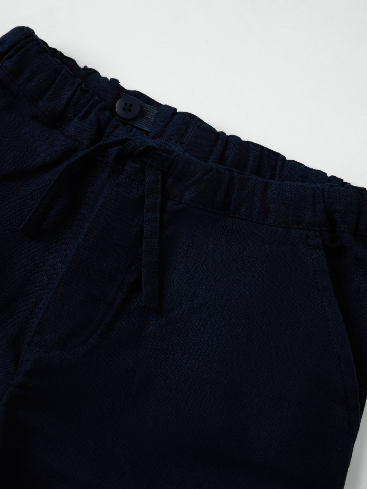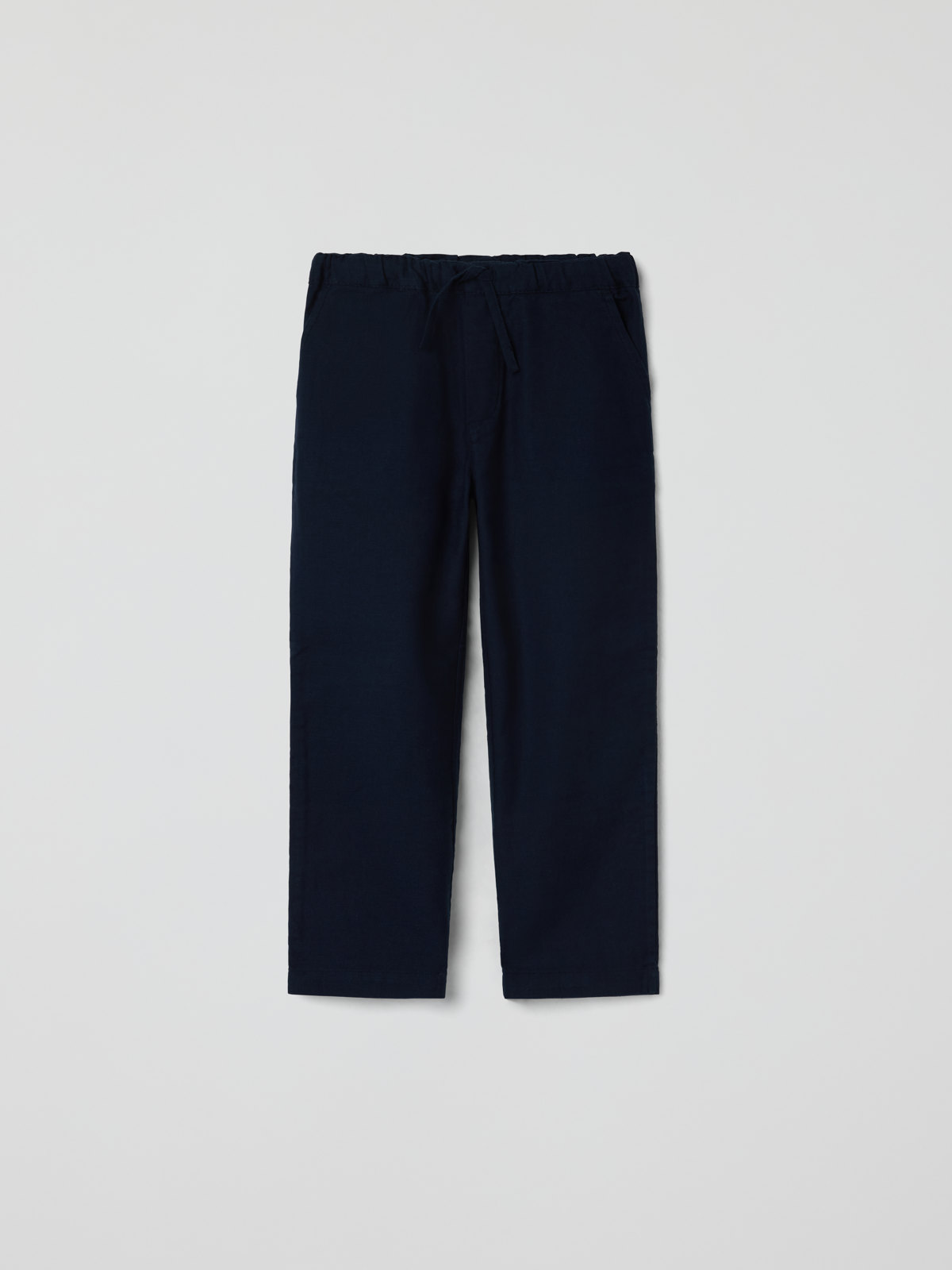 Enfärgad byxa i tunn ekologisk bomull med linnekänsla – skön både till vardag och fest! Byxan har raka ben, elastisk midja som går att justera med knytband, samt två fickor fram.