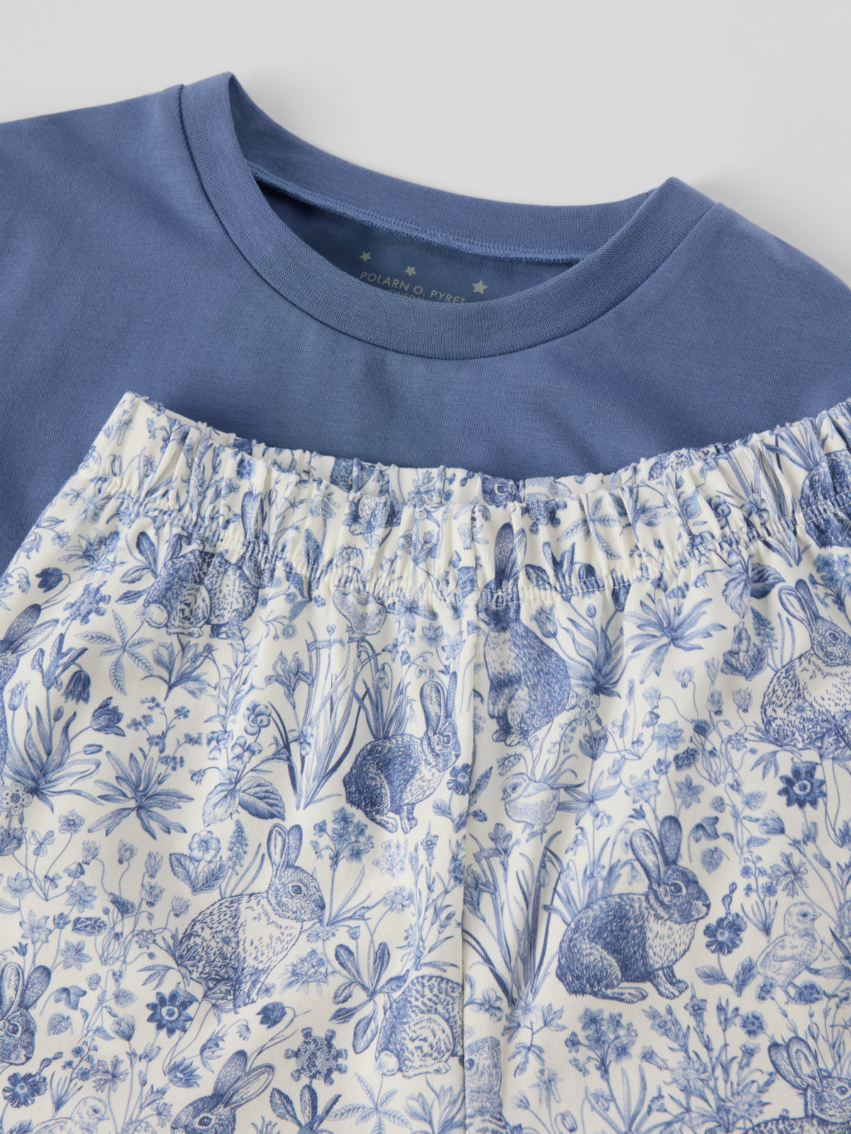 Blommig kortärmad pyjamas i ekologisk bomull sydd med extra mjuka, platta sömmar – en riktig sommarfavorit för sköna nätter! Tröjan har korta ärmar och byxan har raka ben och elastisk midja.