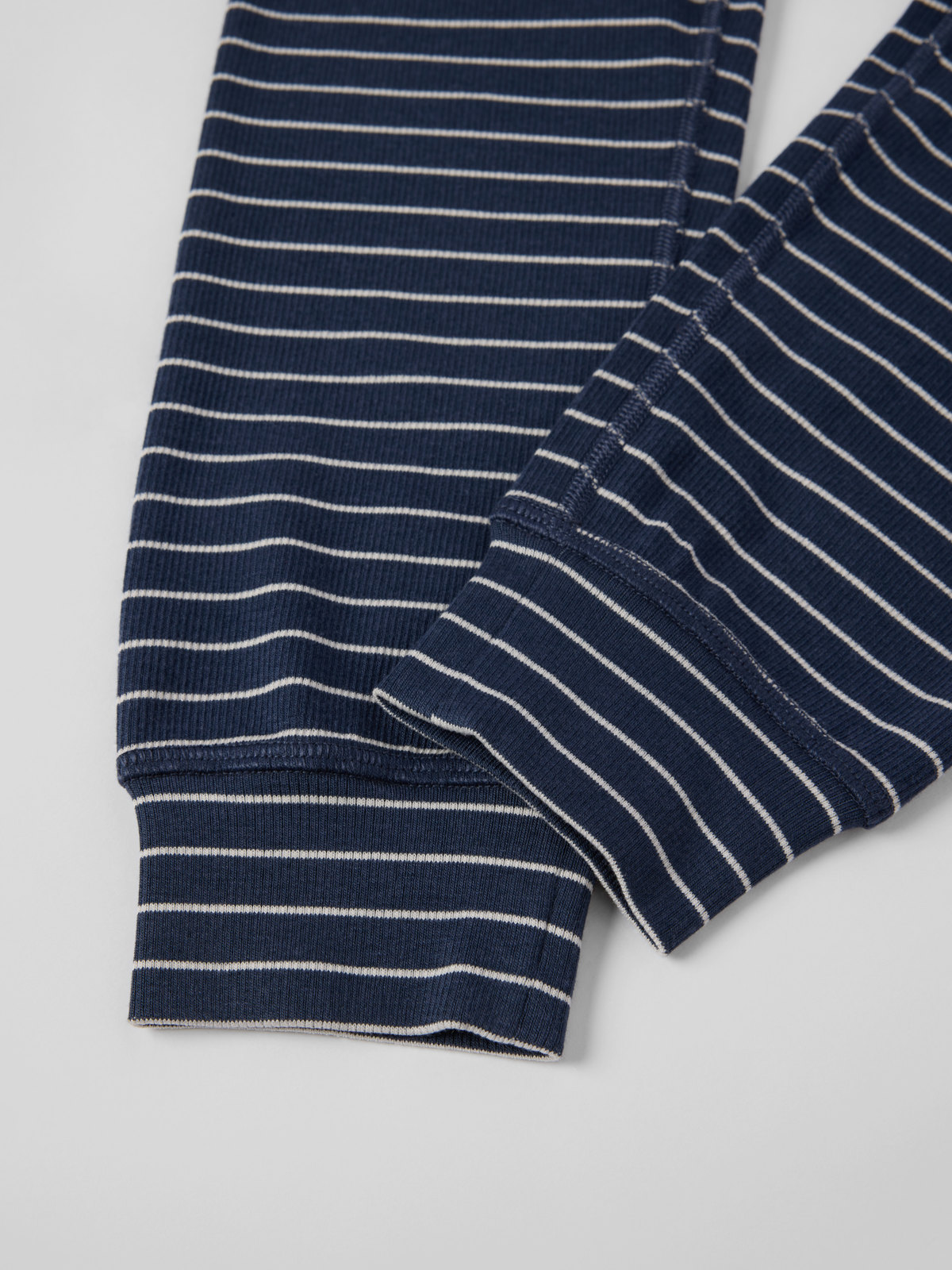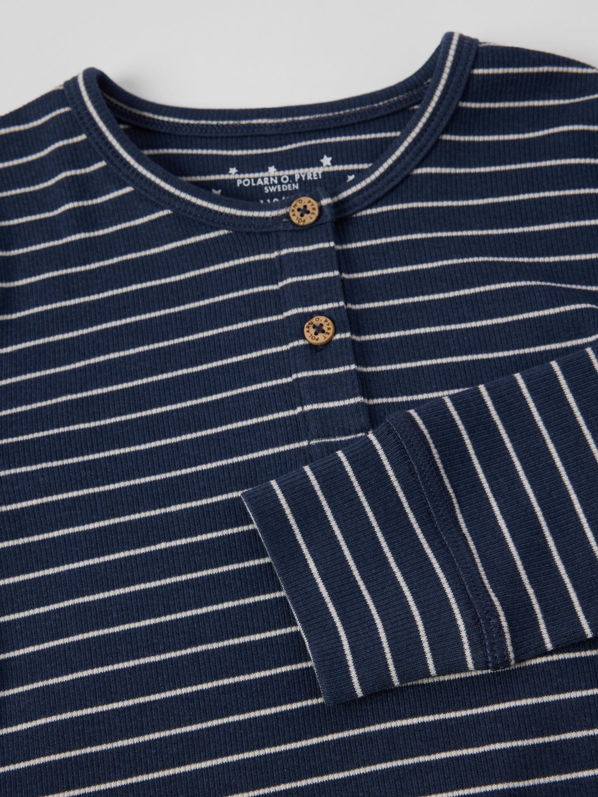 Randig tvådelad pyjamas i tunn och sval trikå av Tencel™ lyocell och ekologisk bomull, sydd med extra mjuka sömmar som inte skaver. Tröjan har kort knappslå fram och byxan har muddar i bensluten för skön passform.