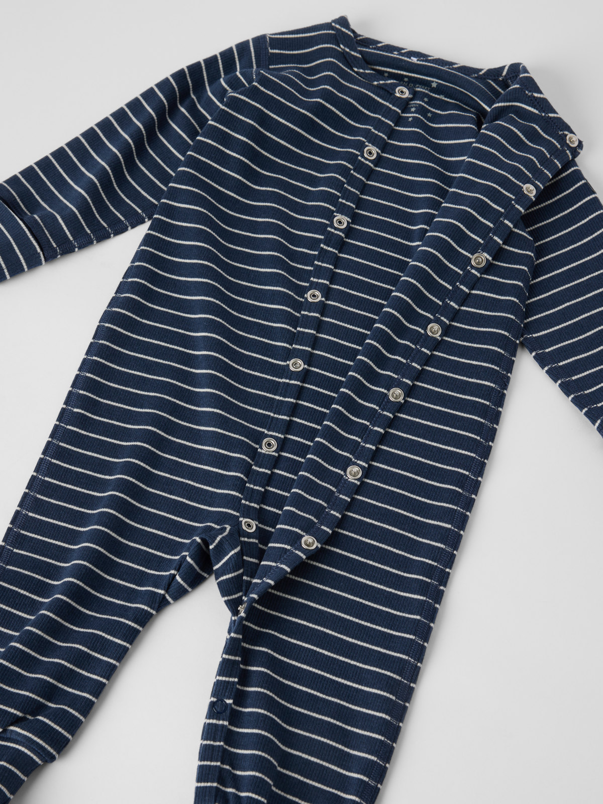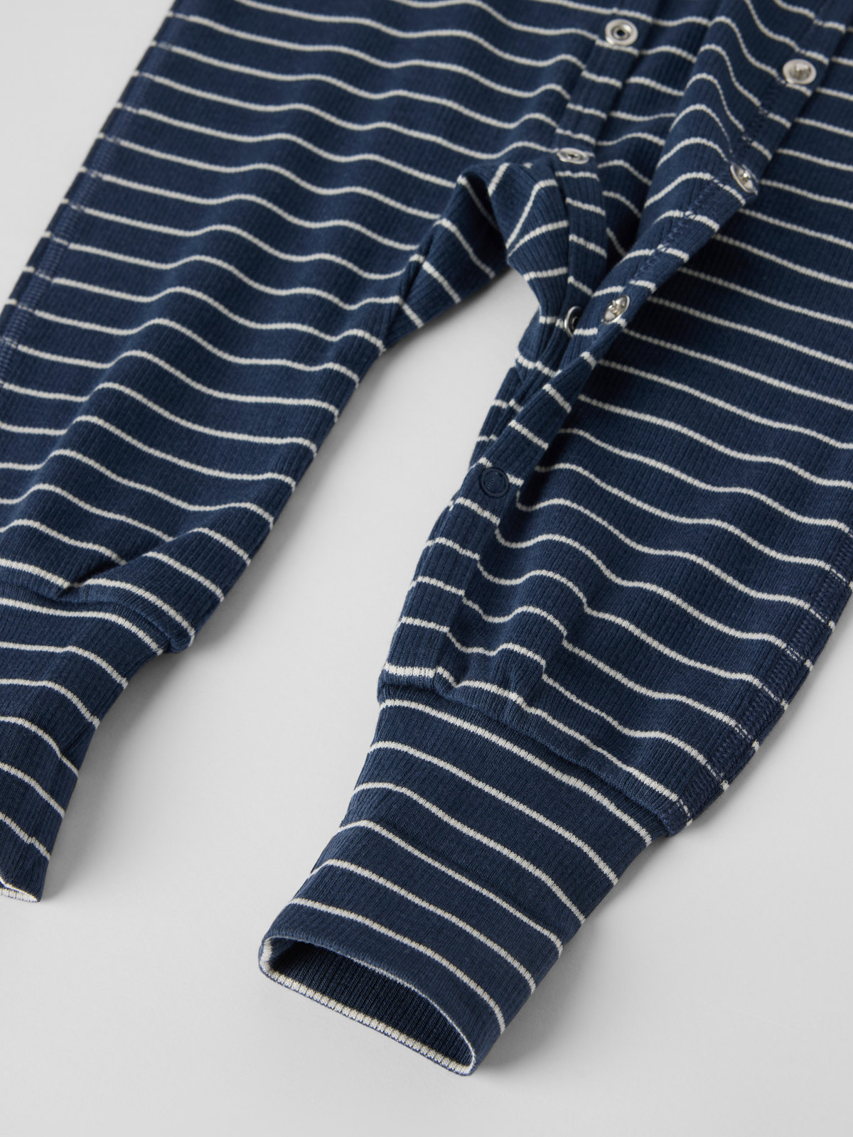 Randig pyjamasoverall i tunn och sval trikå av Tencel™ lyocell och ekologisk bomull för baby, sydd med extra mjuka sömmar som inte skaver. Muddarna i ärm- och benslut är extra långa och går att vika ned allt eftersom barnet växer. Tryckknapparna från hals till benslut förenklar klädbyten.