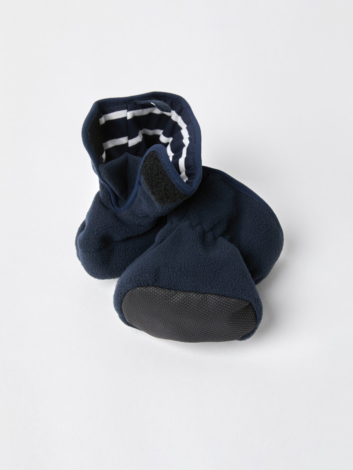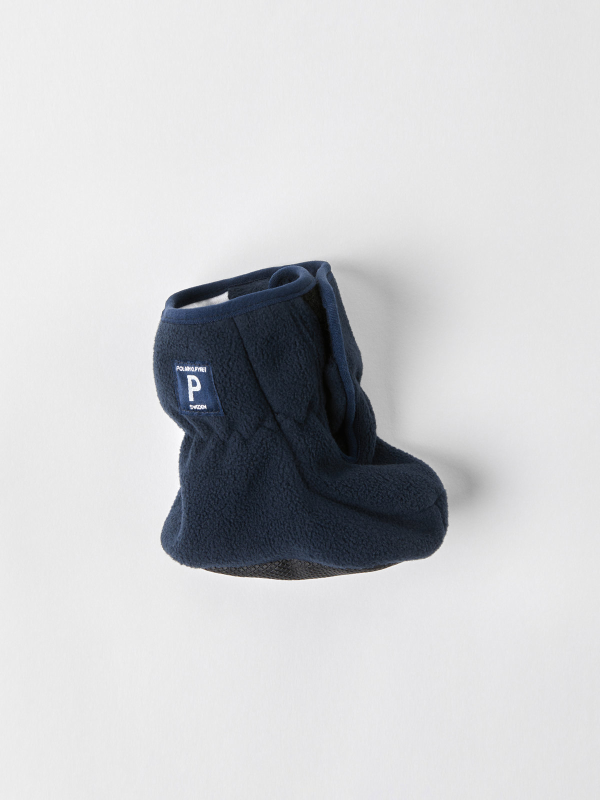 Vindtäta och mjukt vadderade fleecetossor för baby. Perfekt att ha i vagnen! Tossorna är tillverkade i 100% återvunnen Polyester och har ett mjukt foder i 100% ekologisk bomullstrikå. De har elastisk resår kring vristen och karborrekäppning fram, för att gör det enkelt att ta på och av. Sulan har en något stabilare undersida.