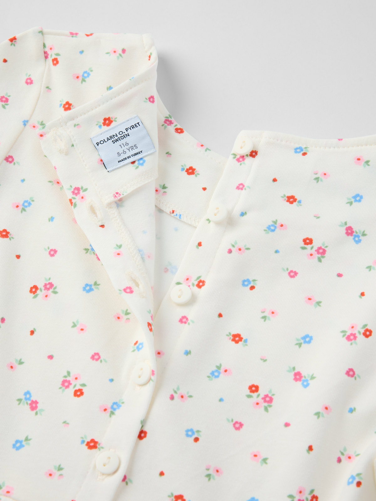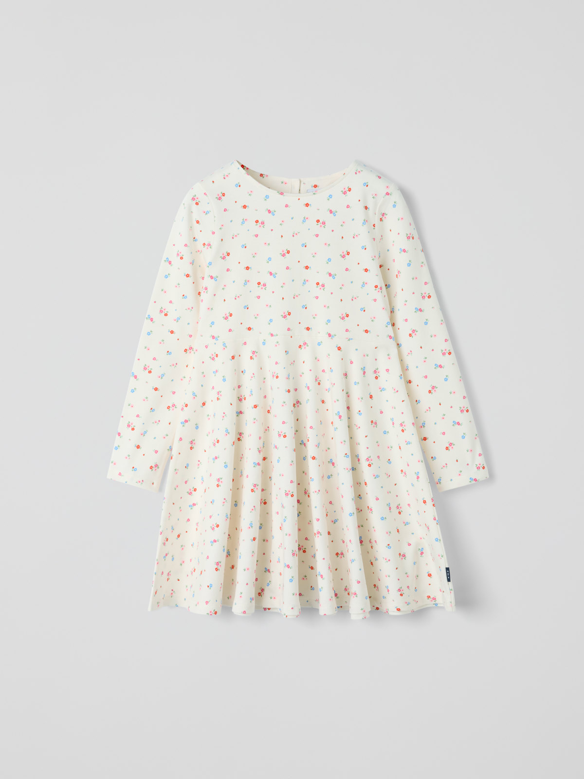 I storlek 86-92 är klänningen högre skuren i midjan och har en rynkad kjoldel.