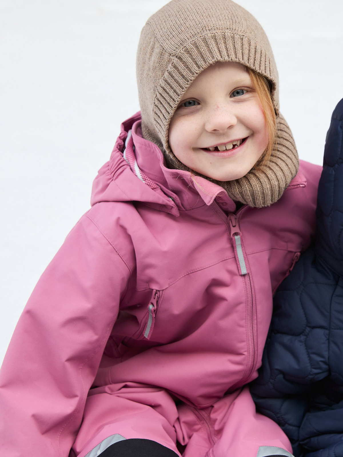Enfärgad balaklava i värmande merinoull- och bomullsmix. Perfekt för vinterutflykter eller i skidbacken! Ribbad mudd runt ansikte och hals ger skön passform.