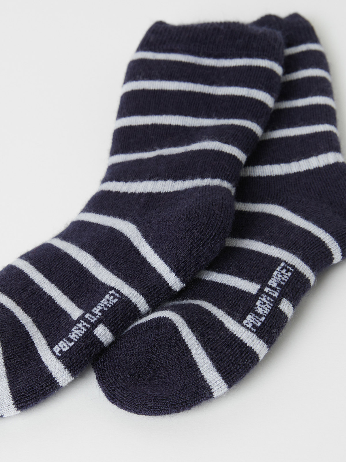 Ett par randiga strumpor i mjuk ullfrotté som håller små fötter varma. Strumporna har vår klassiska rand. Storleken är markerad på insidan av skaftet. Där finns även plats att skriva barnets namn. Lätt att hålla ordning!
