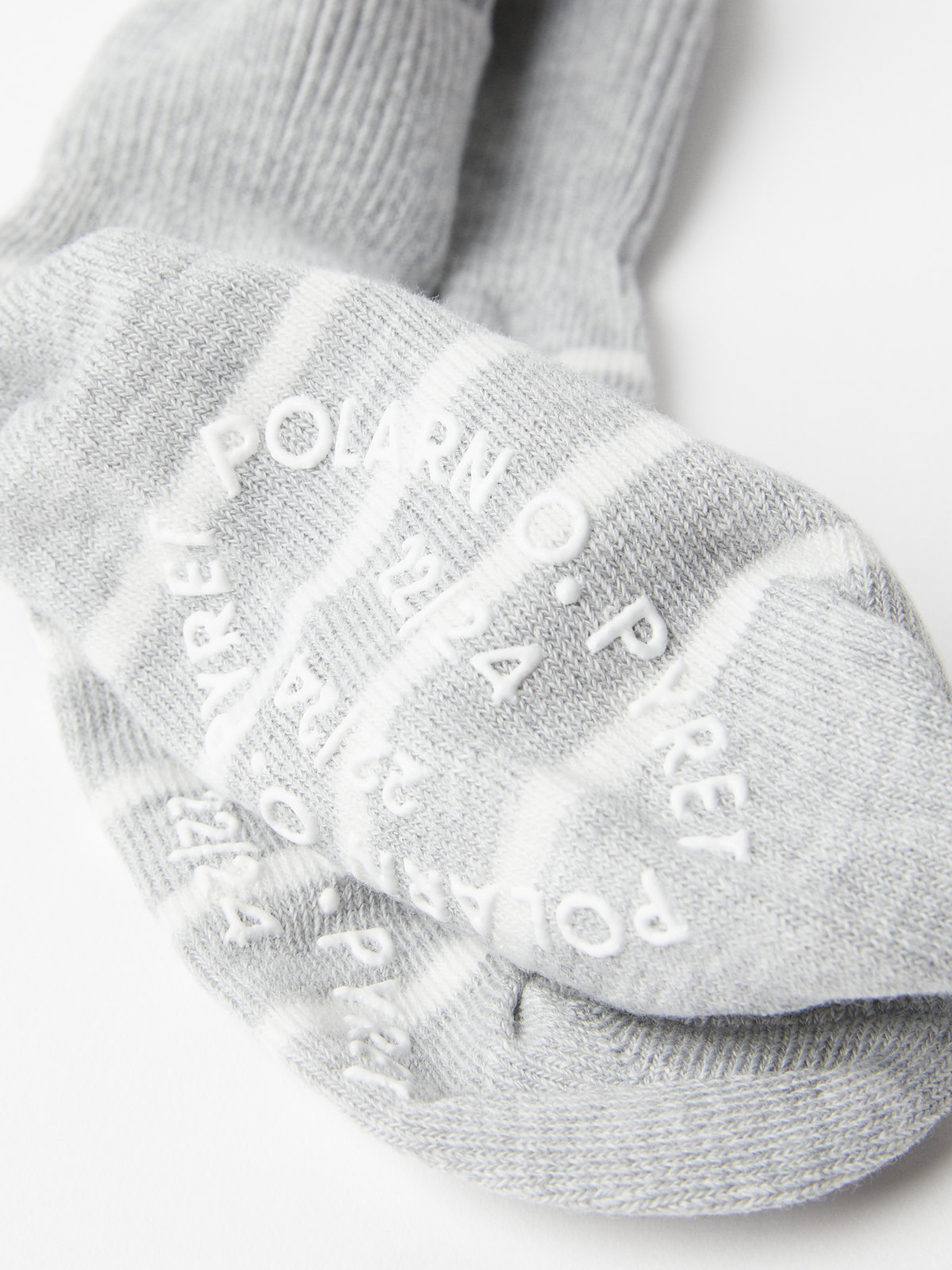 Tvåpack strumpor med halkskydd. Strumporna är tillverkade i mjuk ekologisk bomull och har vår klassiska rand. Mudden kan vikas upp eller ned. Den här produkten ingår i vårt 3 för 2-erbjudande, som ej kan kombineras med andra erbjudanden.