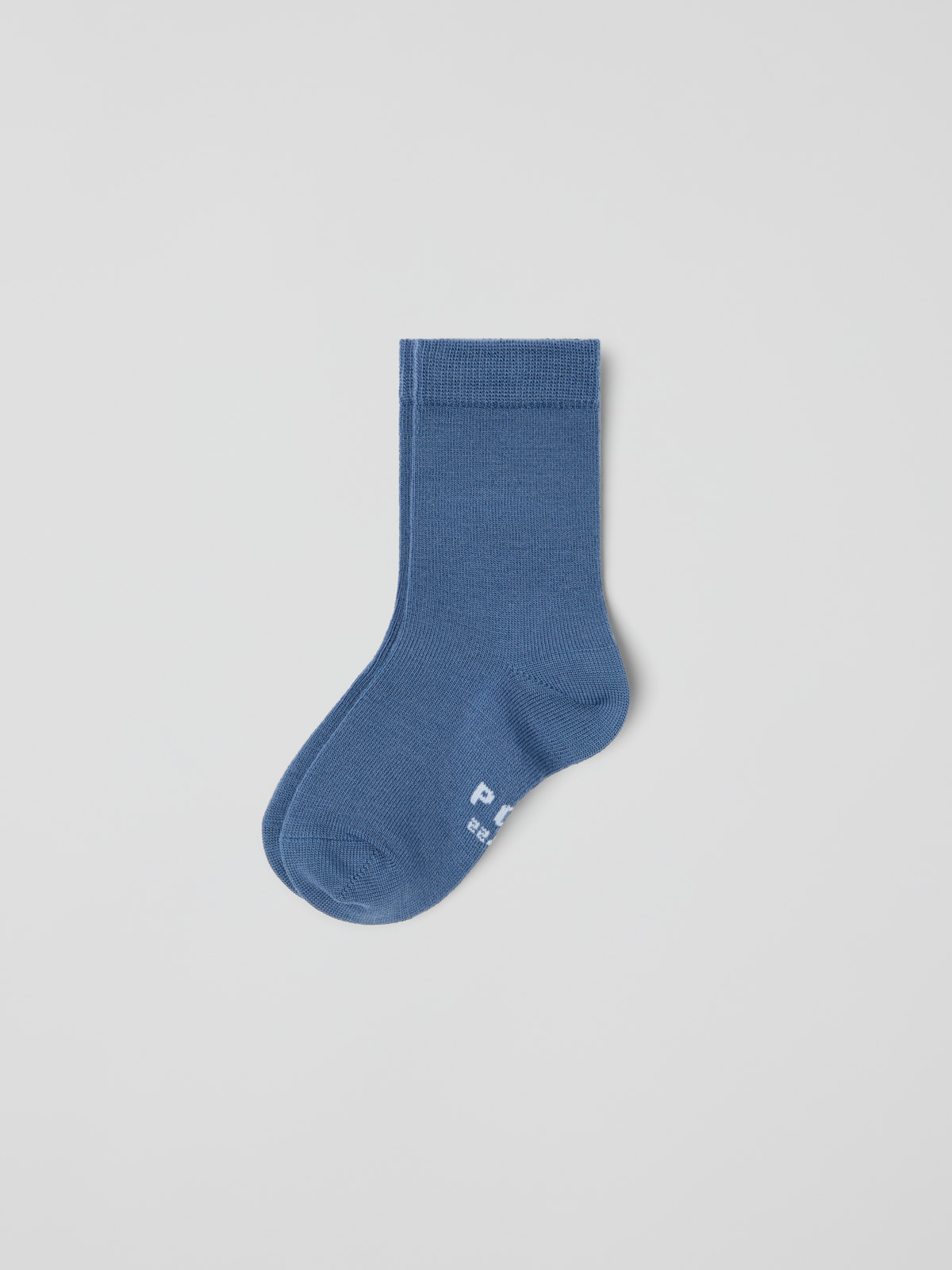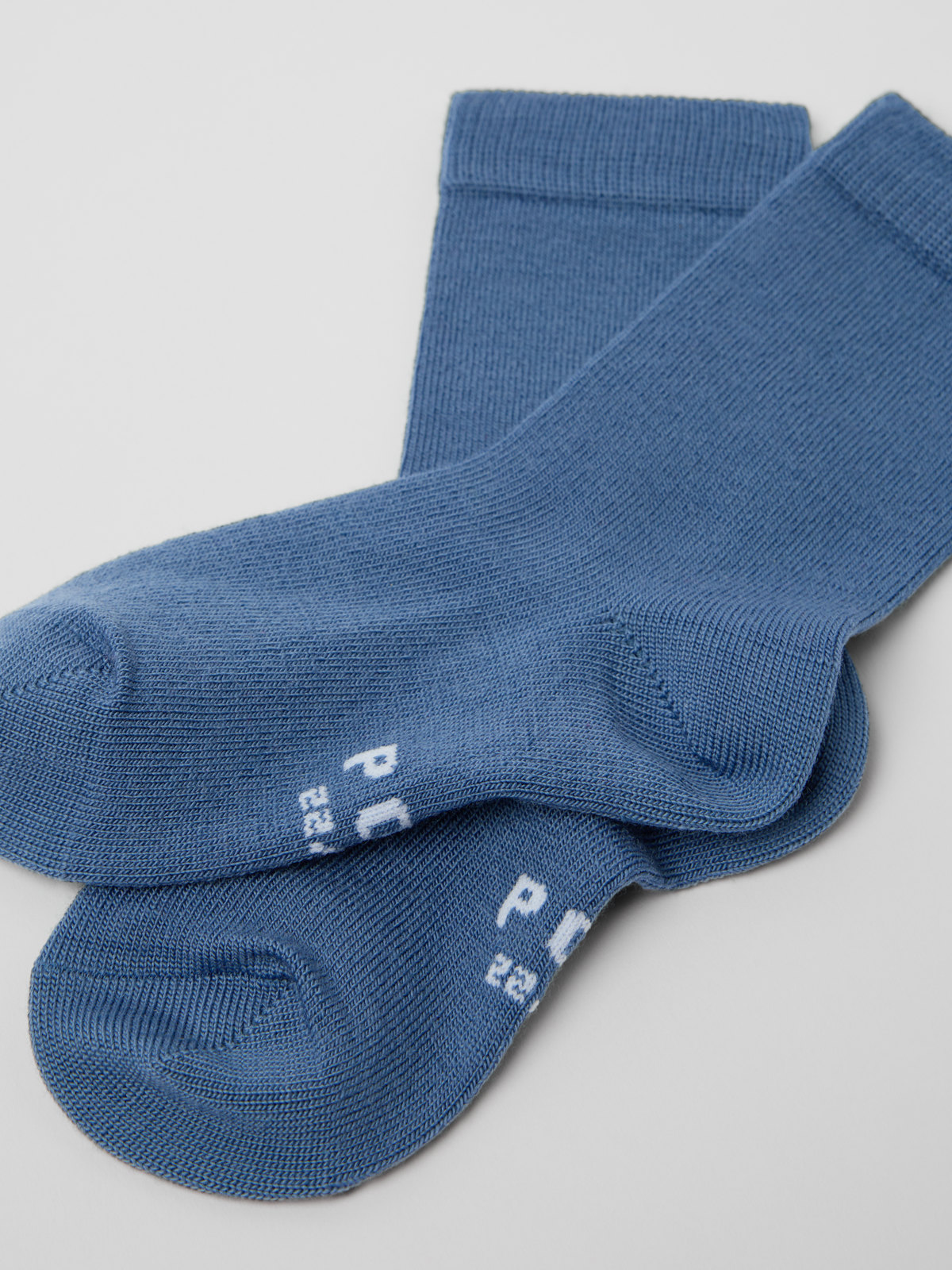 Ett par enfärgade strumpor i tunn merinoull som värmer gott och är mjuka för små fötter. Storleken är markerad på insidan av skaftet. Där finns också plats att skriva barnets namn. Lätt att hålla ordning!