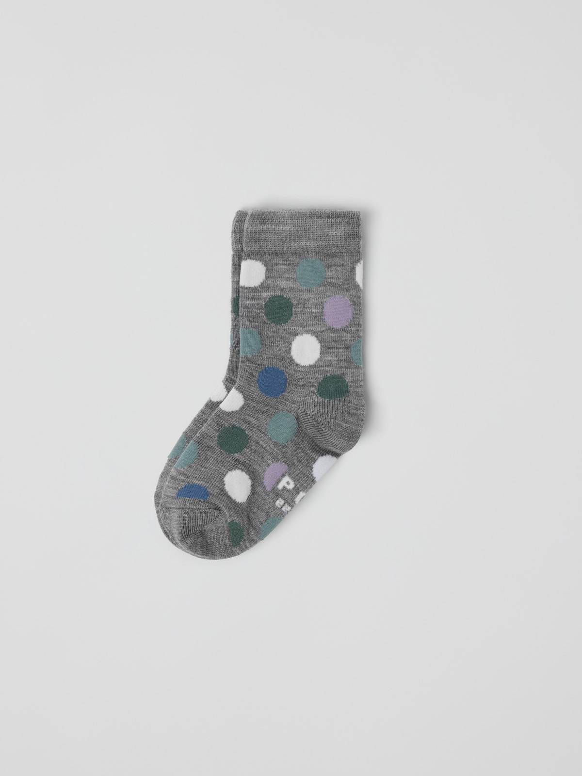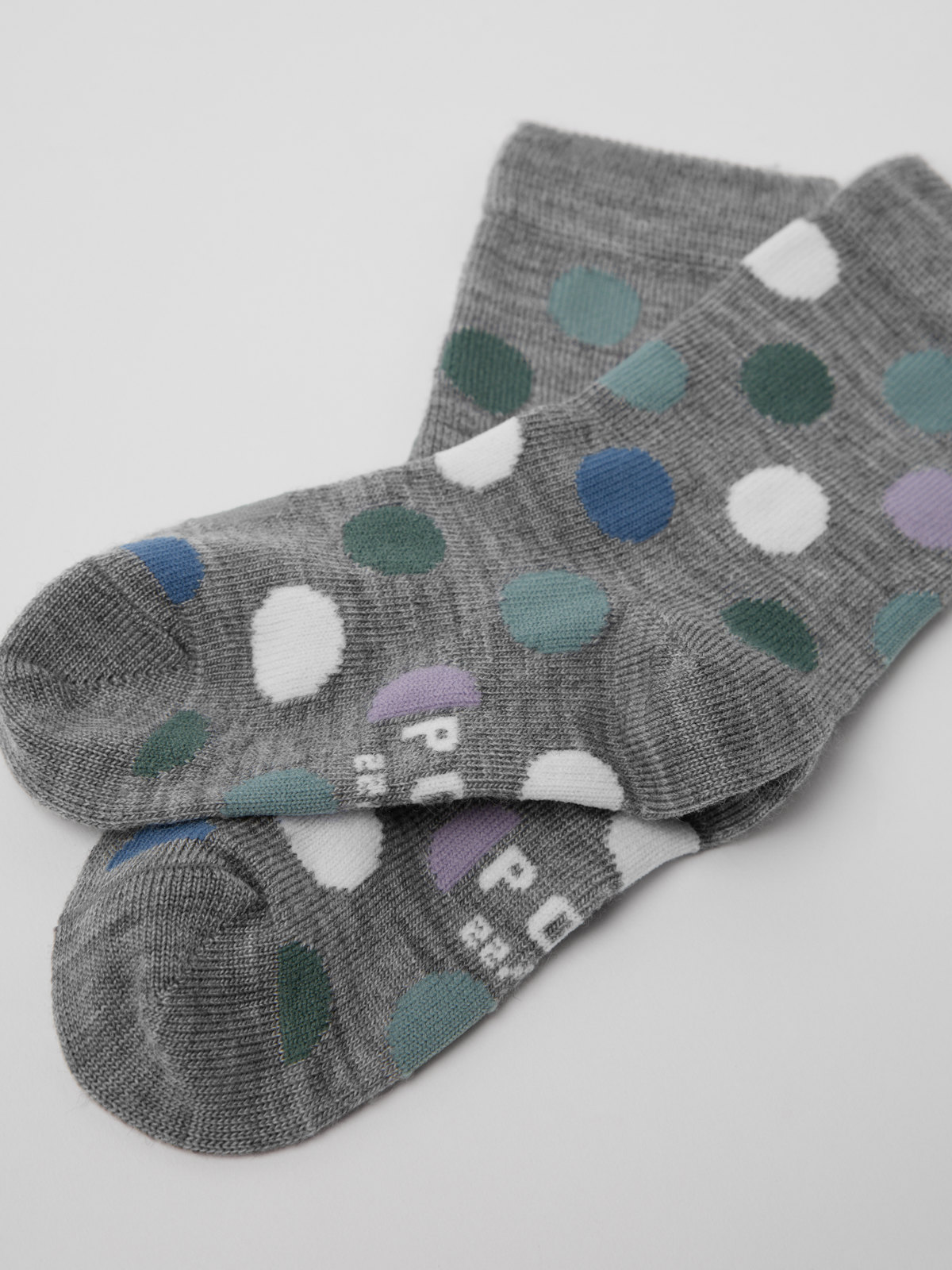 Ett par prickiga strumpor i tunn merinoull som värmer gott och är mjuka för små fötter. Storleken är markerad på insidan av skaftet. Där finns också plats att skriva barnets namn. Lätt att hålla ordning!