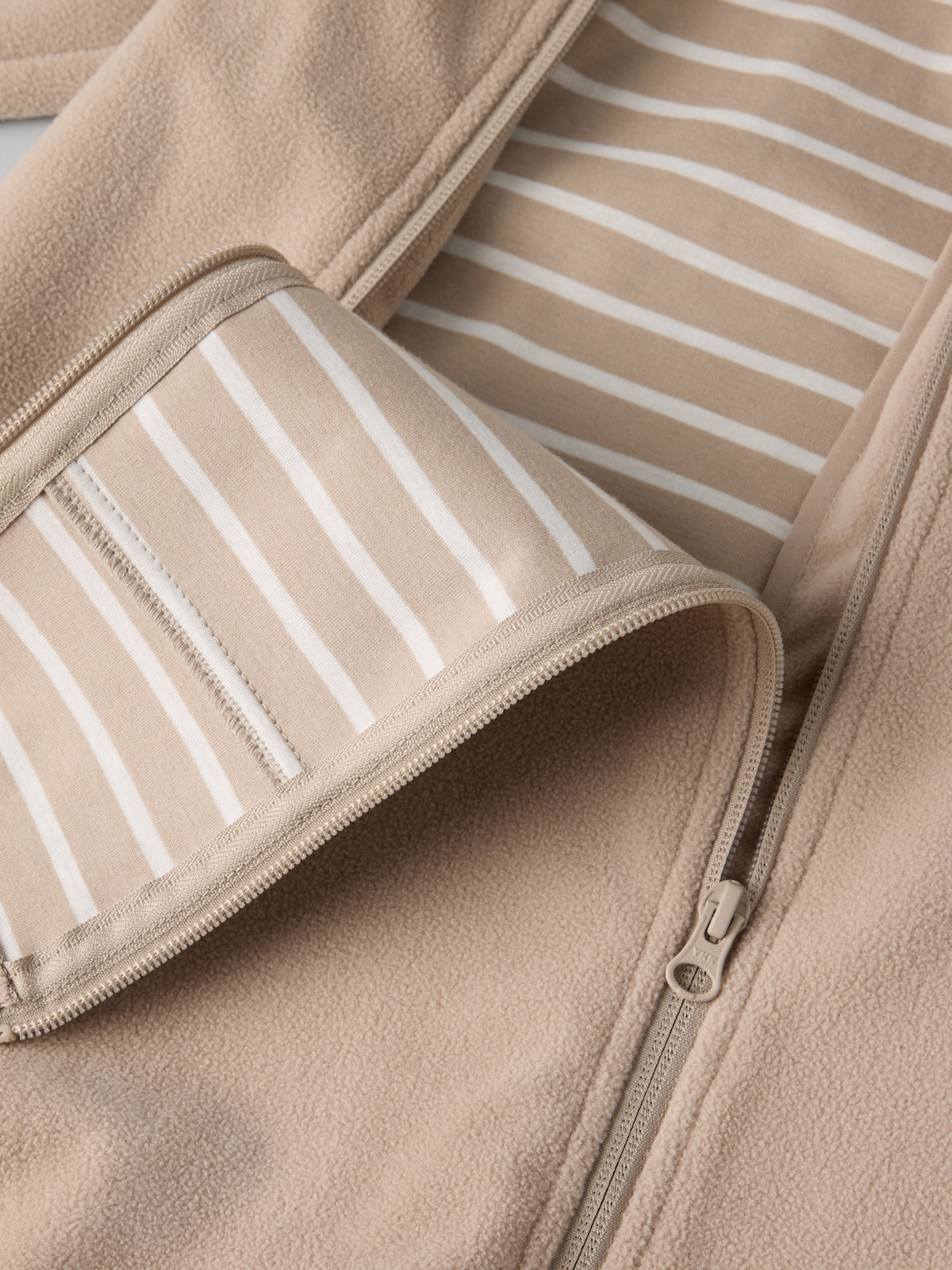 Overallen är tillverkad i återvunnen polyester med god andningsförmåga och är fodrad med mjuk trikå i 100 % ekologisk bomull med vår klassiska rand. Den har fast huva och dubbla dragkedjor fram för att underlätta klädbyten. Dragkedjorna har en vindslå på insidan som ger extra skydd mot kall luft samt ett skydd högst upp för att inte skava mot haka och kind.