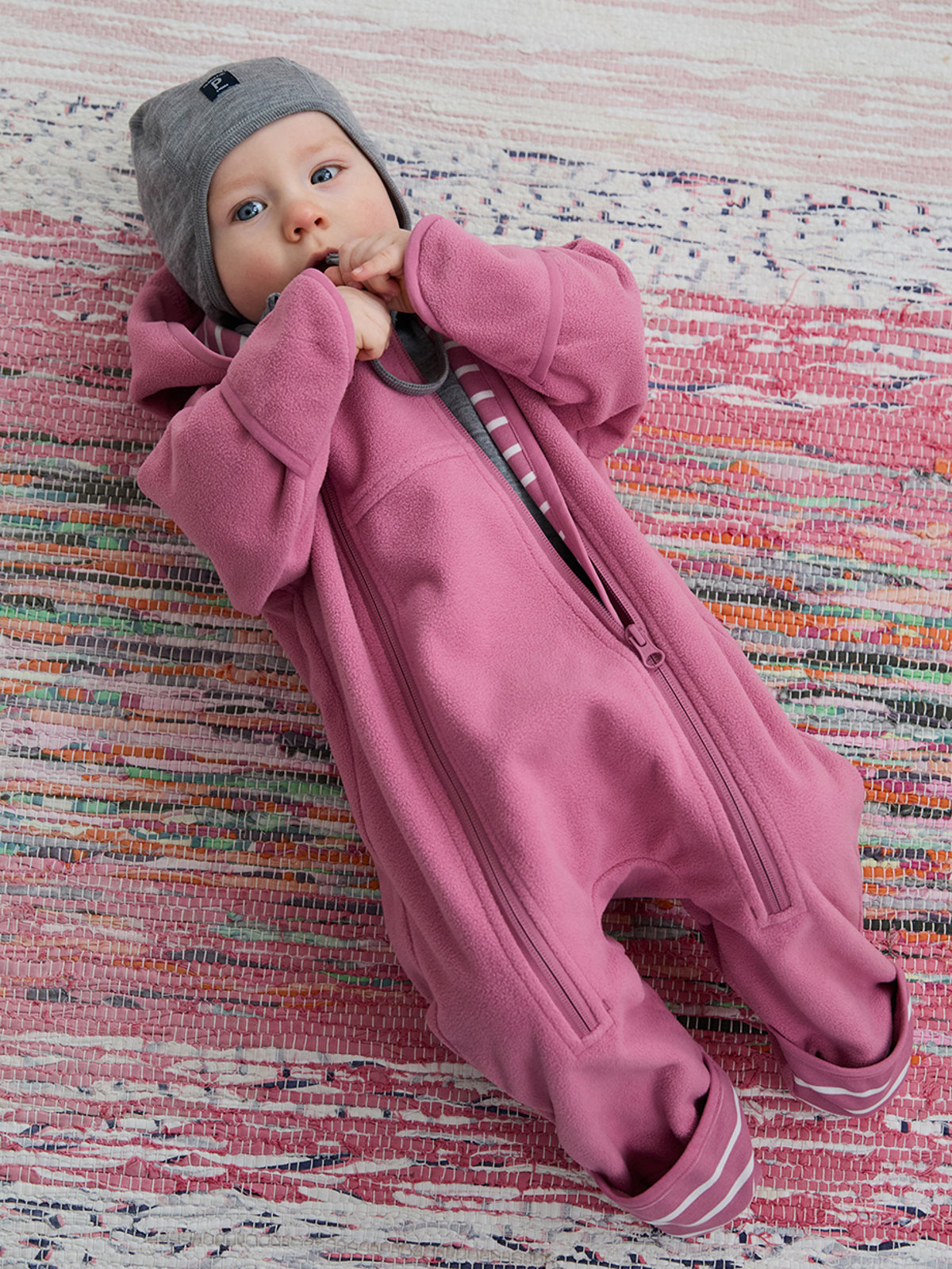 Overallen har dessutom rundade ärm- och benslut med övervikbart tyg som ger skön värme små händer och fötter.