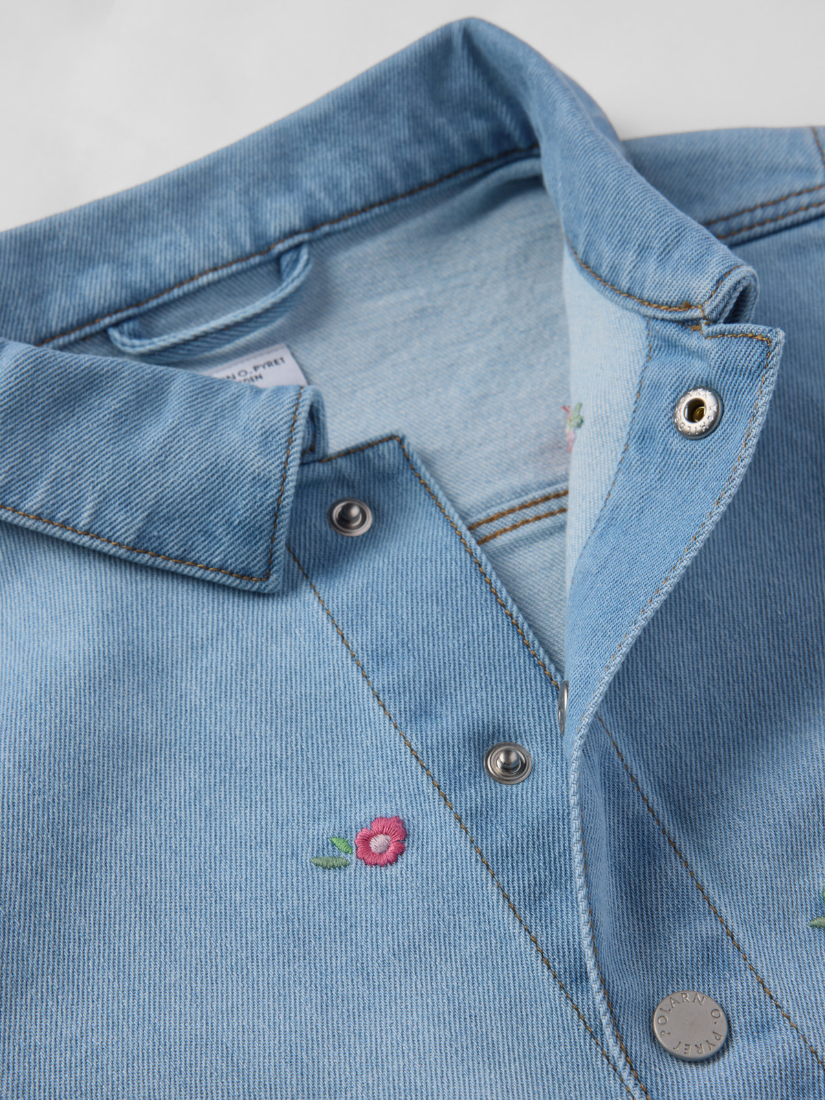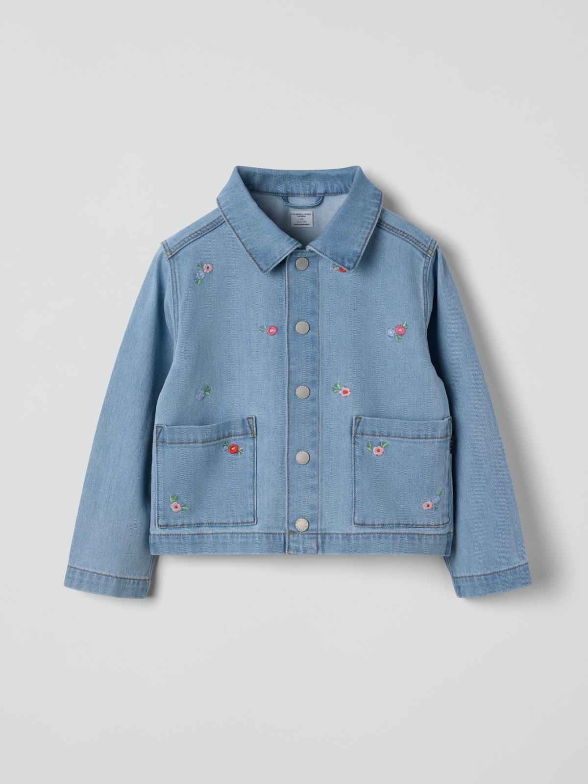 Jeansjacka i mjuk och skön denim med lätt stretch – perfekt för sköna vår- och höstdagar! Jackan har små broderade blommor och två stora fickor fram. Den stängs med tryckknappar.