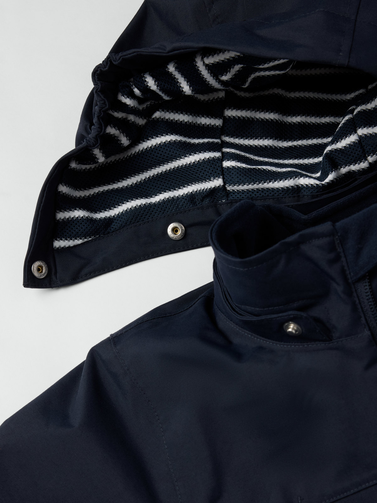 • Den reglerbara huvan är avtagbar och går att fästas med tryckknappar för ökad säkerhet, den har även elastik i sidorna för bästa passform