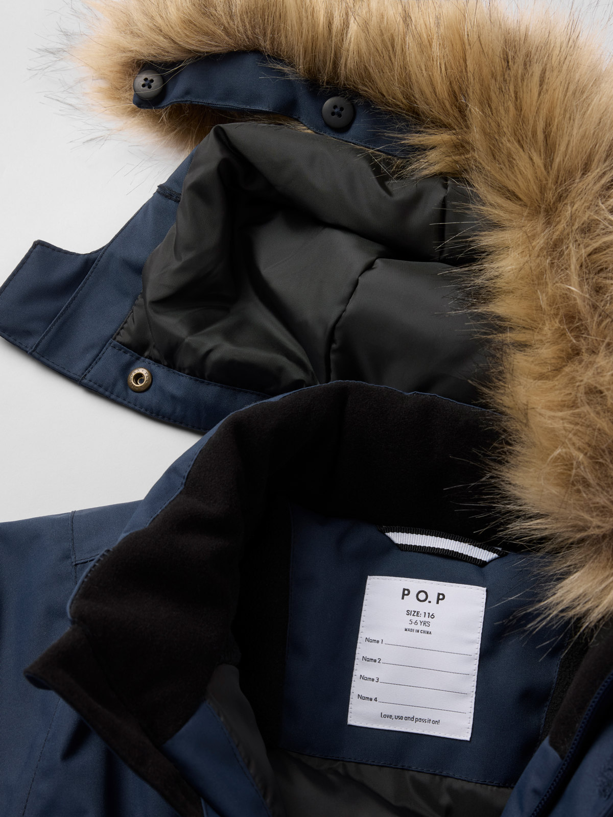 • Den reglerbara huvan är avtagbar och går att fästa med tryckknapparför ökad säkerhet. Den har även avtagbar syntetisk päls för extra skydd