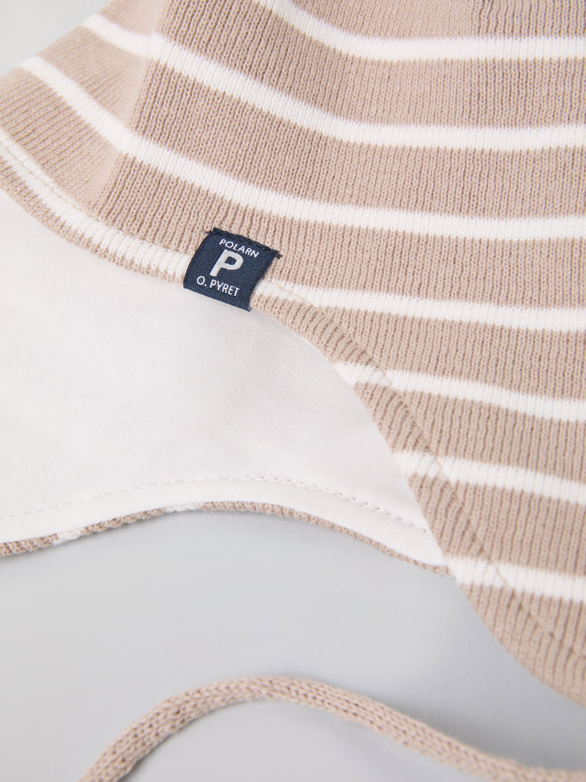 Vindtät mössa i stickat material med tunt trikåfoder och smart knytband – en klassiker i kylan.